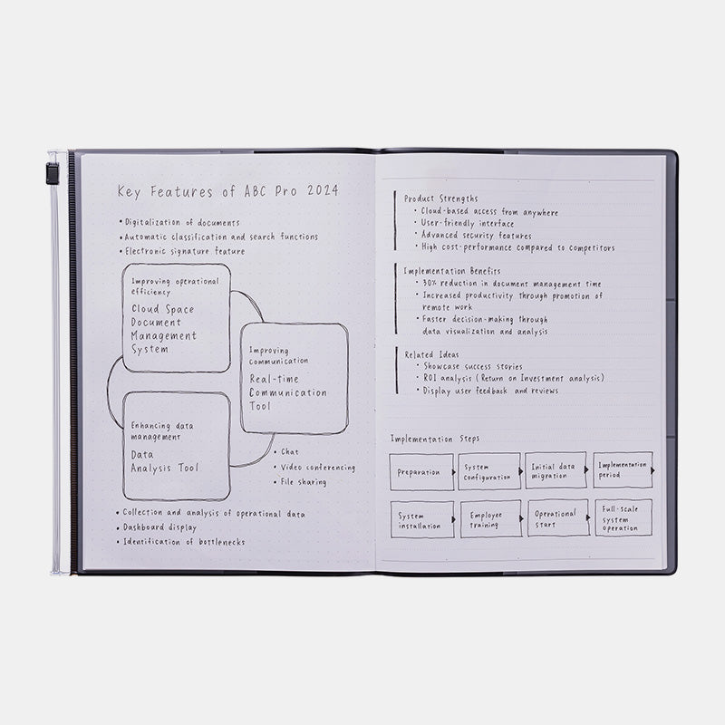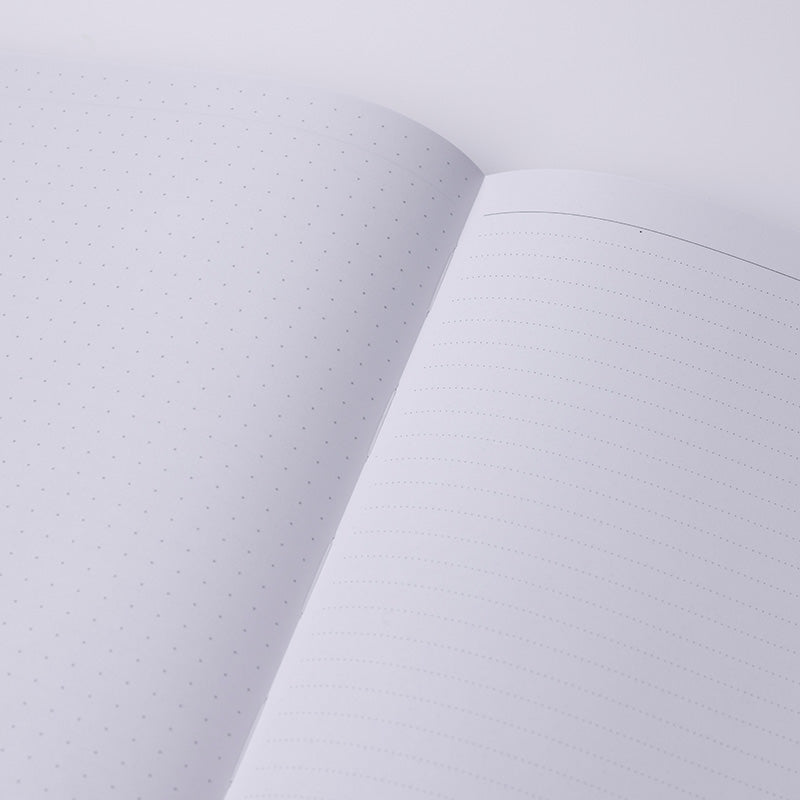 Incluye un cuaderno con 128 páginas que combinan dos acabados. Trama de puntos por una cara y rayas en la otra. Tiene papel con certificado FSC. El papel original fabricado exclusivamente para la agenda MARK'S se utiliza por primera vez en este cuaderno. Su suave tacto al escribir y la resistencia al sangrado en la agenda se han hecho realidad también en el cuaderno.