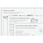 Además de las páginas diarias, incluye una variedad de secciones útiles para organizar tu año: calendario anual, mensual e índice anual, así como páginas extra al final como “Memorias 2026”, “12 hábitos para mejorar tu concentración” o “Consejos para un sueño reparador”.