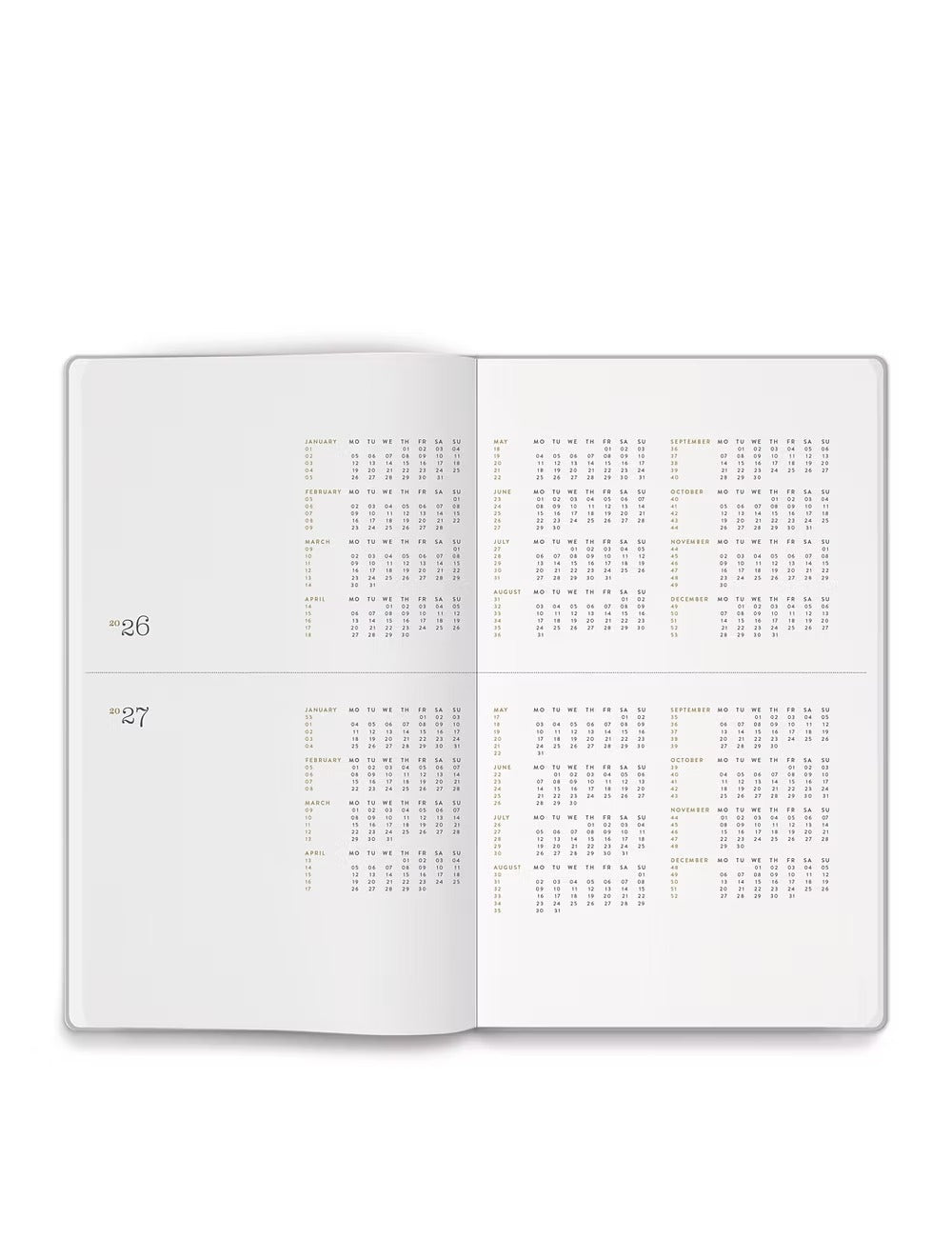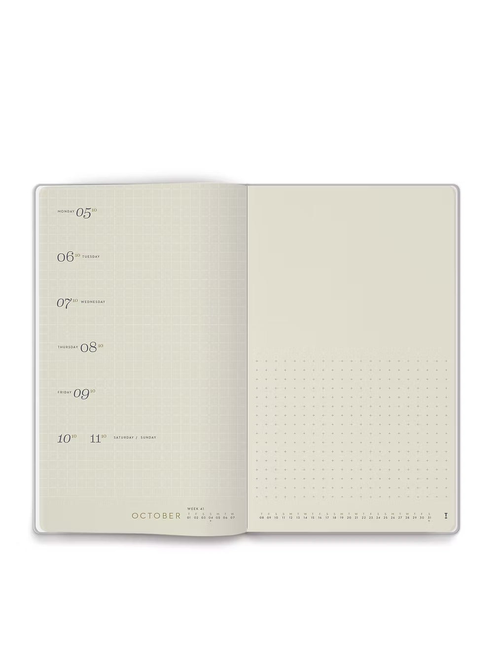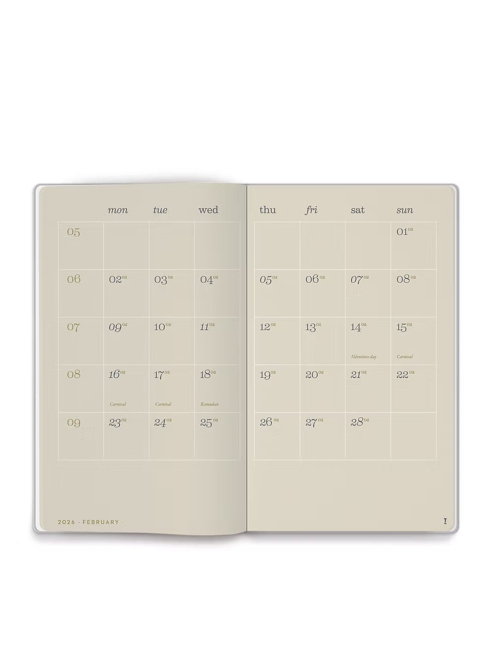 La agenda 2026 de Tinne+Mia va de Enero a Diciembre 2026 tiene una cubierta forrada en fino lino para libros Impreso con detalles laminados y serigrafía inspirada en la artesanía más clásica.