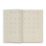 • Incluye una vista mensual de Enero a diciembre presentada en 2 páginas, las semanas empiezan en domingo. El color del papel es gris claro.