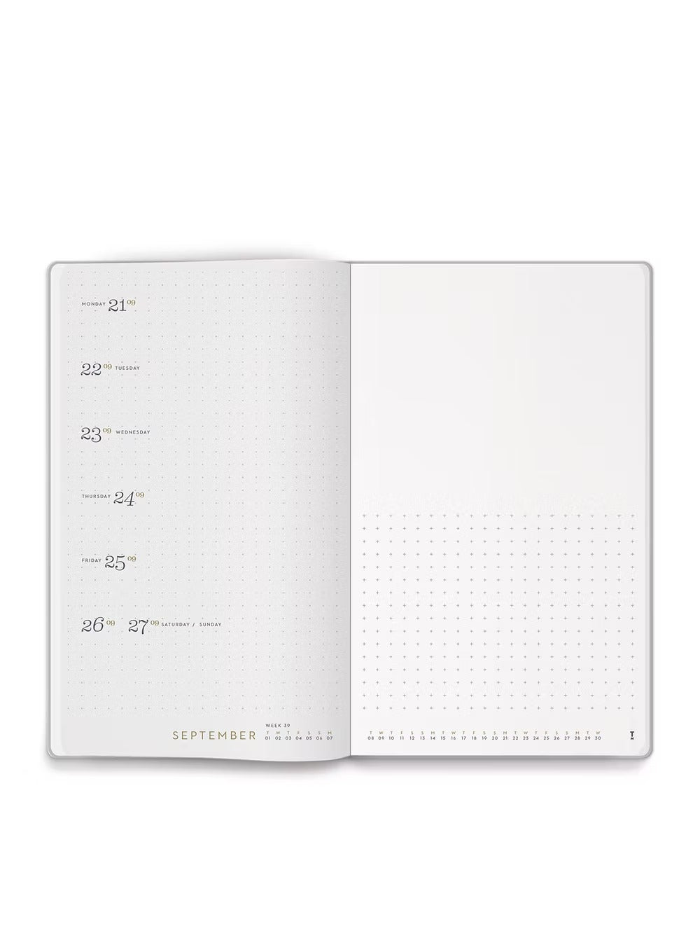 Vista semanal: En la página de la izquierda hay un resumen semanal y en la página de la derecha hay espacio para notas.