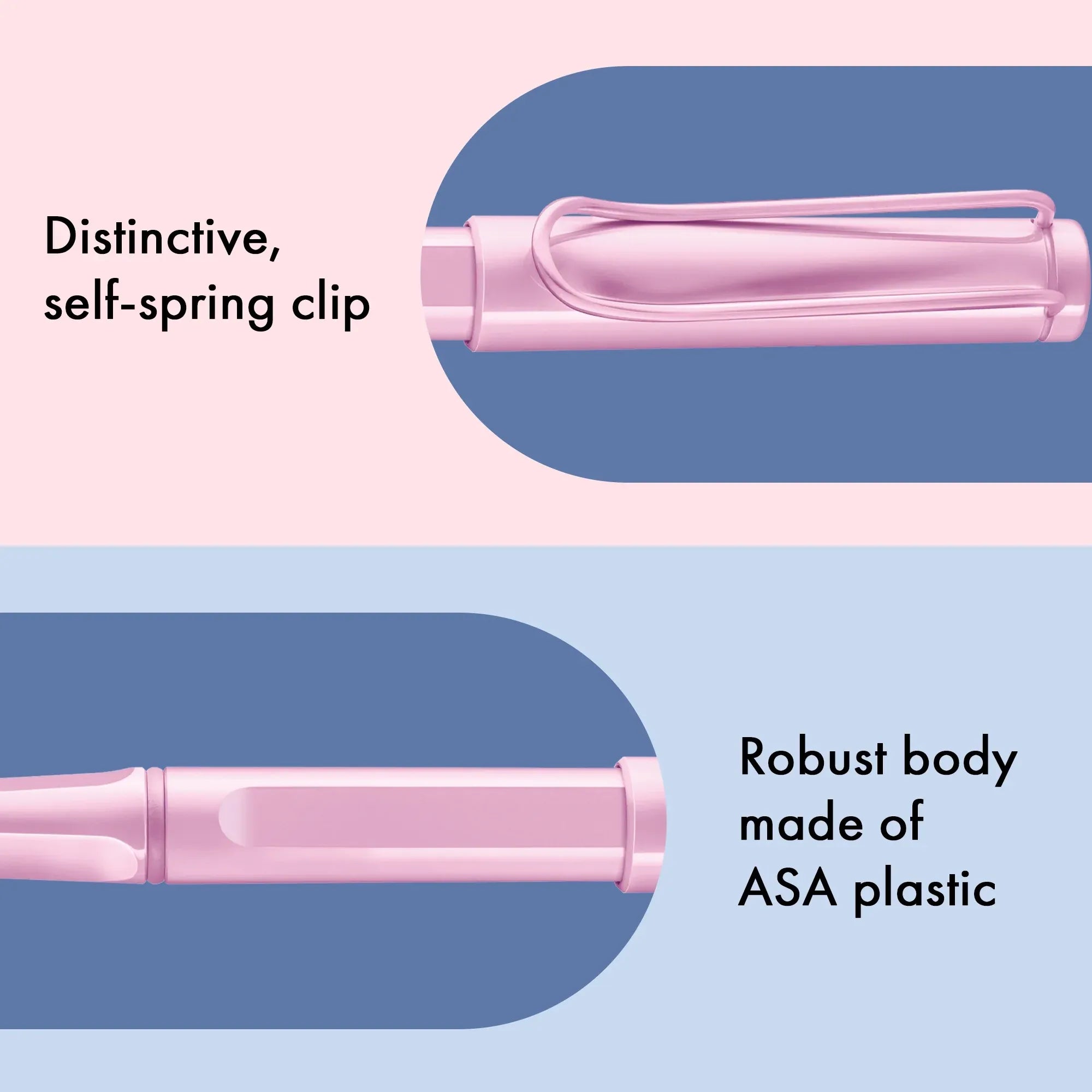 Fabricado en plástico ASA brillante de alta resistencia, es ligero, robusto y está pensado para el uso diario. Su clip metálico retráctil garantiza un transporte seguro y su forma plana impide que ruede sobre la mesa.