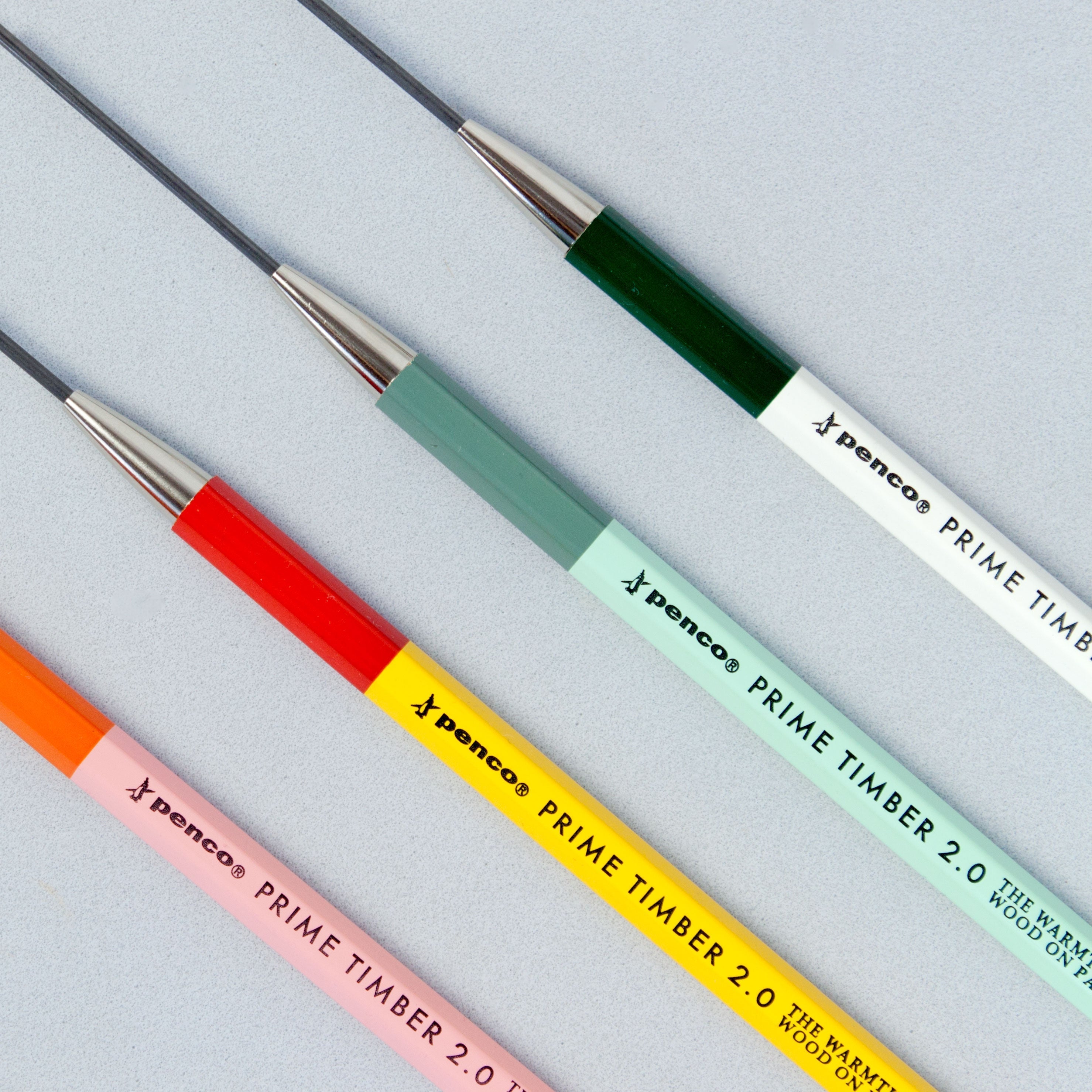 Portaminas con cuerpo de madera y mina gruesa de 2 mm de Penco. Viene con un sacapuntas y una mina B.