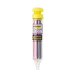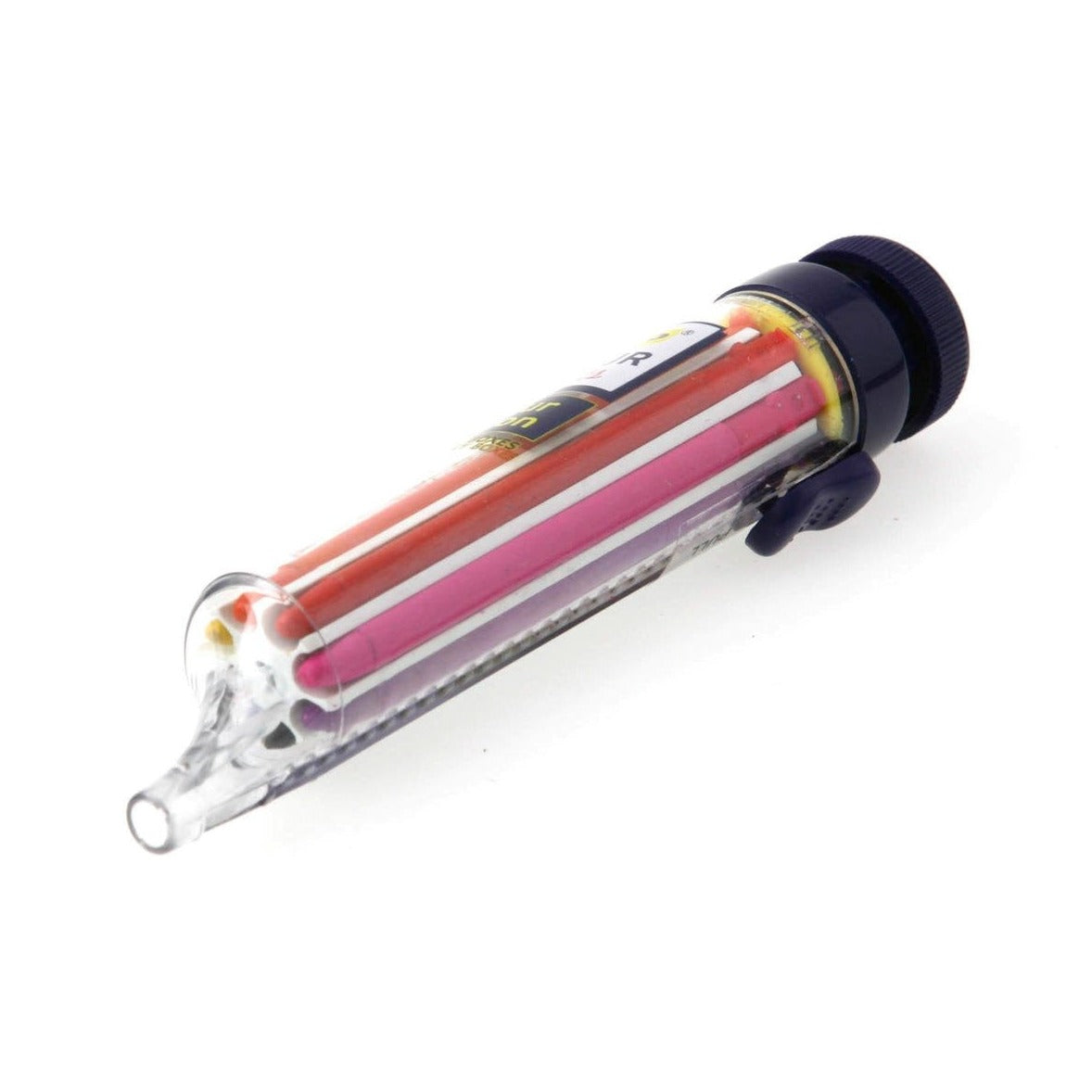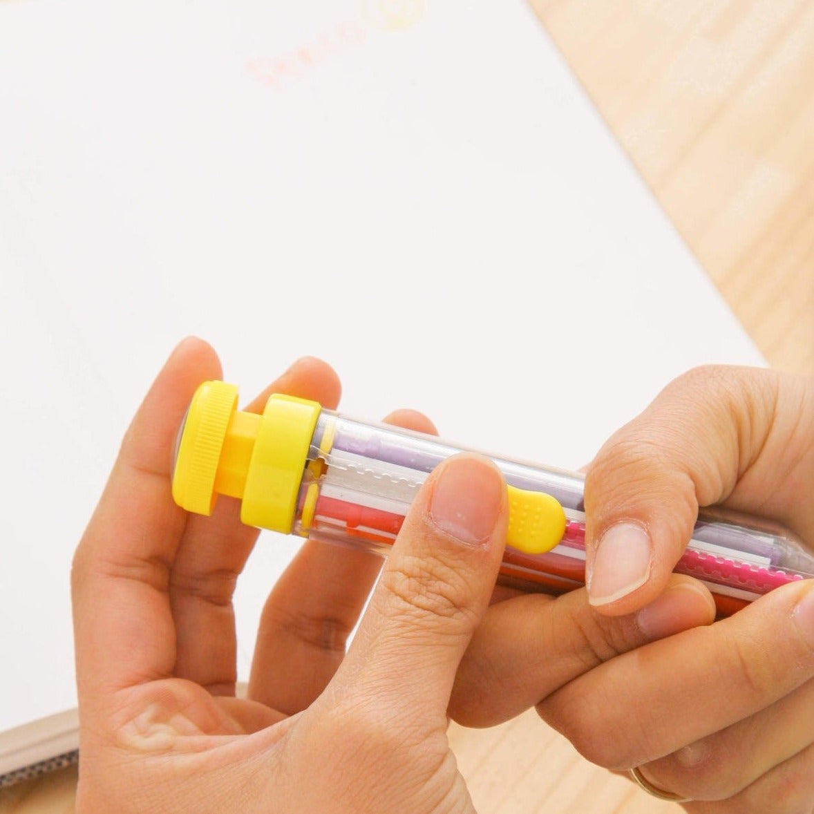 Un lápiz de 8 ceras de colores en 1 (amarillo, naranja, rojo, rosa, lmorado, negro, azul y verde), compacto y fácil de usar.
