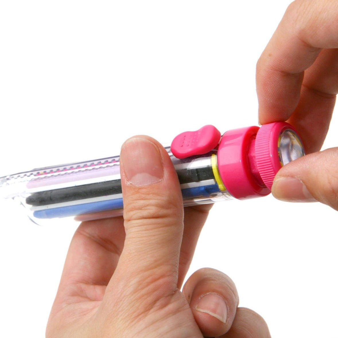 Un lápiz de 8 ceras de colores en 1 (amarillo, naranja, rojo, rosa, lmorado, negro, azul y verde), compacto y fácil de usar.