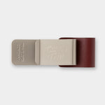 El clip metálico está grabado con láser con el logotipo de la colección LOVE AND TRIP, y el soporte está fabricado en cuero vacuno rojo burdeos, haciendo juego con el resto de la edición limitada.