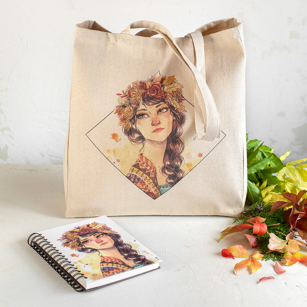 Bolso tipo tote con una ilustración impresa a todo color, 100% algodón grueso de 300g/m2 reciclable y biodegradable. Certificación OECO TEX 100% libre de tóxicos.