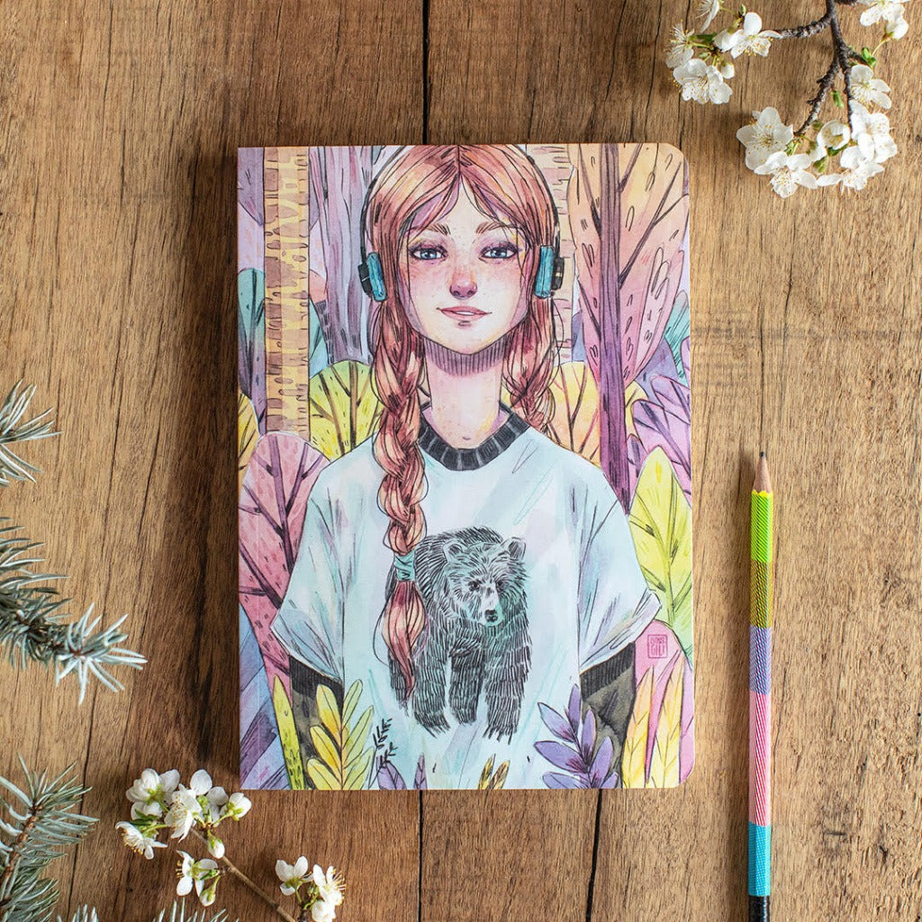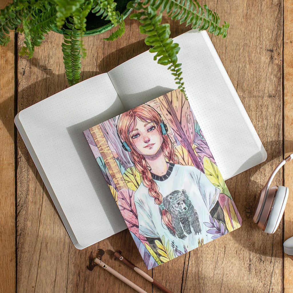 Cuaderno con malla de puntos de 160 páginas, tamaño 16,5 x 23,5 cm, ilustrado por Esther Gili.