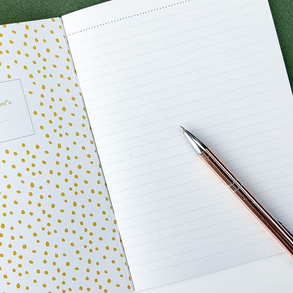 Este cuaderno está hecho con papel reciclado y tiene hojas con líneas.