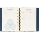 El interior incluye: Vision board, planificador de gastos, horarios, plazos de entrega, prioridades mensuales con seguimiento de hábitos, planificador mensual, 8 hojas de notas y check list de arte