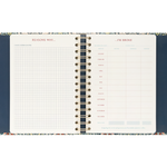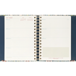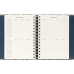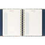 La vista semanal se presenta en 2 páginas y la disposición está en forma de cuadrícula. De lunes a jueves en página impar y de viernes a domingo, con un espacio para notas en página par.