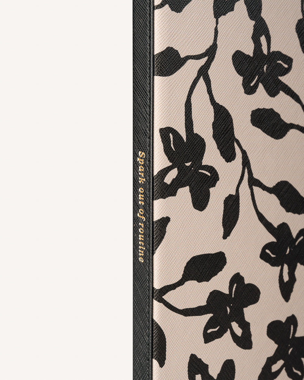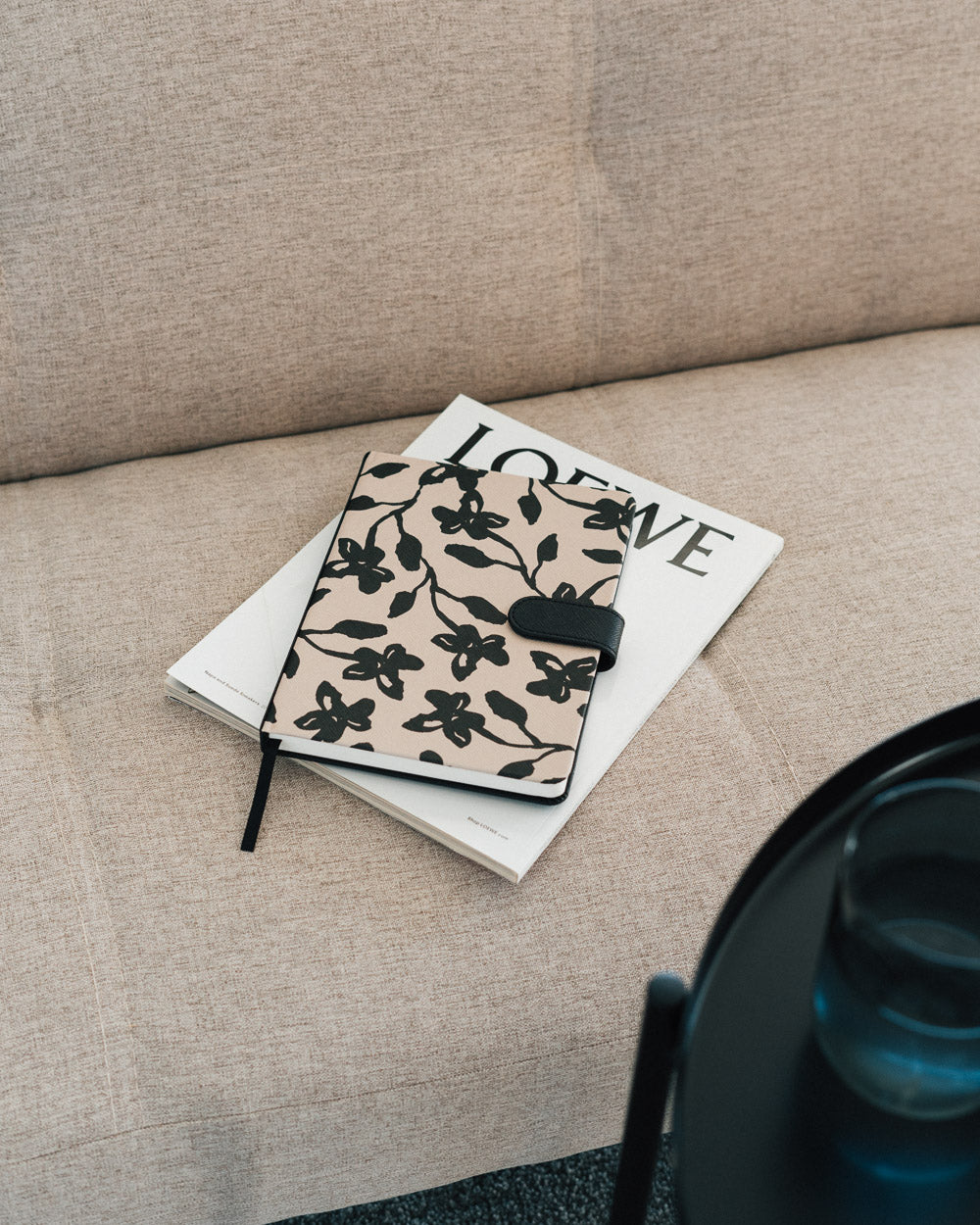 Este cuaderno en tamaño mediano destaca por su diseño floral en tonos tierra, con una tapa de piel sintética que combina estética y resistencia. Su cierre magnético y la cinta marcapáginas negra aportan un toque funcional y sofisticado. Gracias a su encuadernación cosida, se abre completamente para ofrecer una experiencia de escritura fluida y cómoda en cualquier superficie.