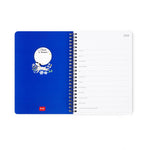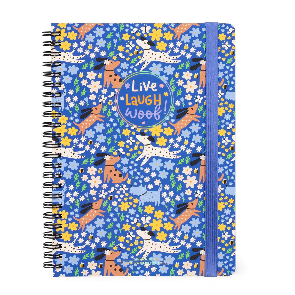 Presenta una práctica encuadernación de espiral y una resistente portada rígida decorada con motivos caninos. Está fabricada con papel certificado FSC de 70 g/m² e incluye detalles funcionales como esquinas redondeadas y un bolsillo final de PVC para documentos.