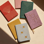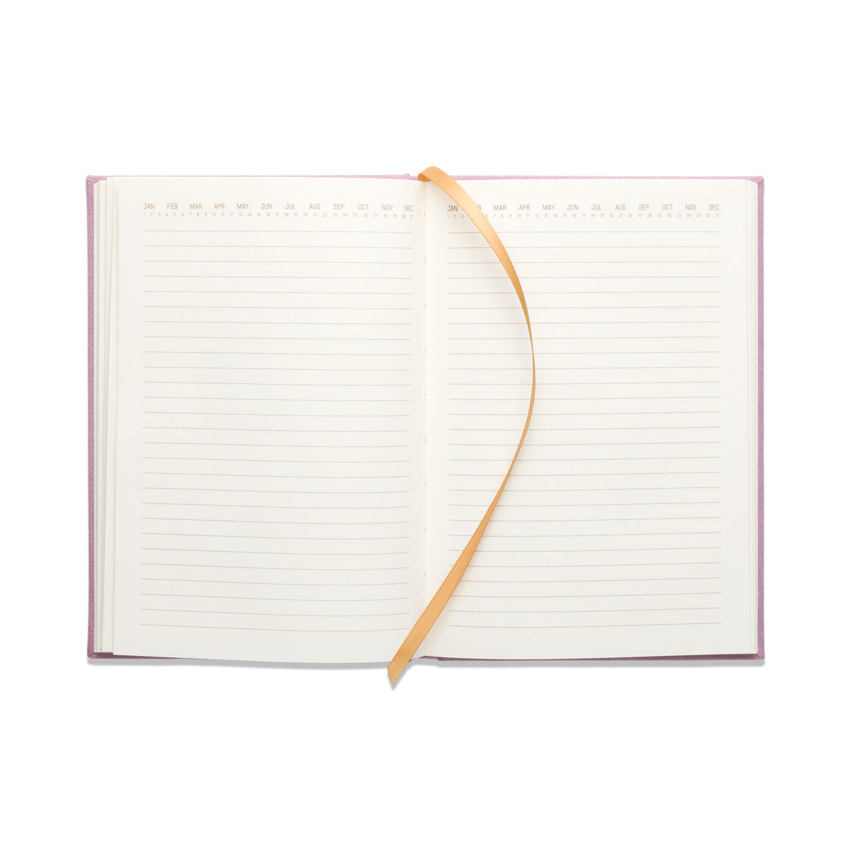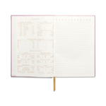 Este bonito cuaderno tiene un agradable tacto similar al ante por su cubierta forrada en tela suave, su bonito diseño tipográfico con un toque art decó en dorado le da una elegancia muy sutil.