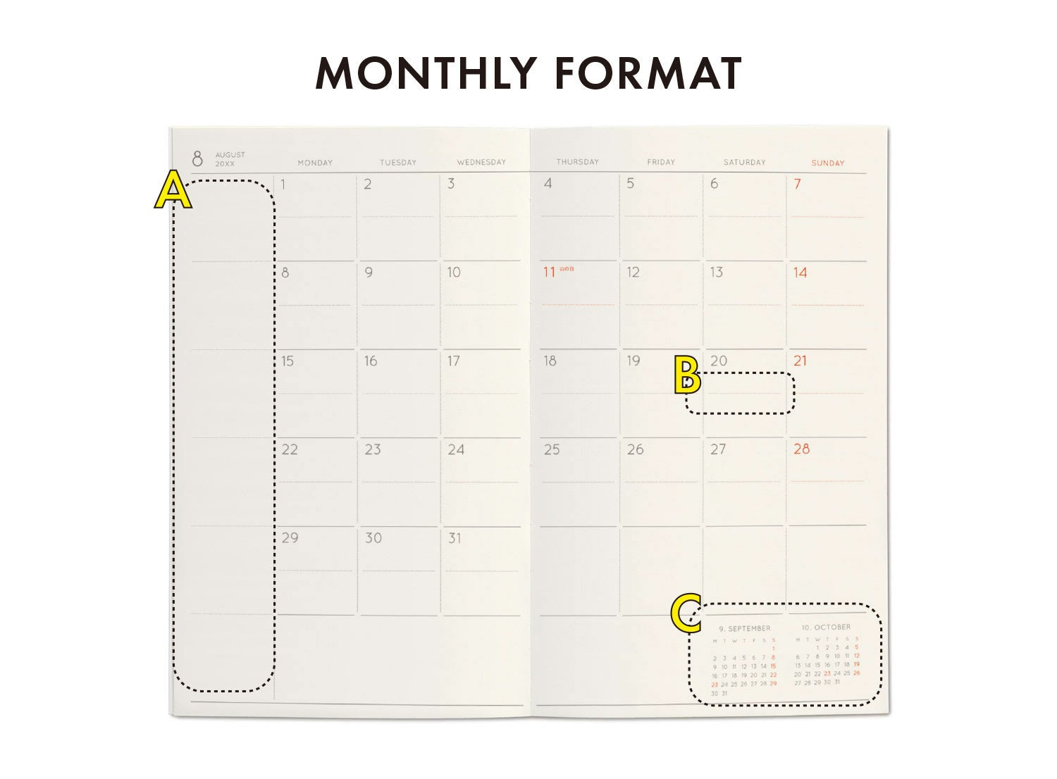 Planificador mensual, empieza en Octubre 2024 a Enero 2026 tiene formato B6 slim.