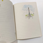 Diario de viaje ilustrado. Hojas de diferentes tipos (liso, cuadros, rayas…) y decoradas con ilustraciones diferentes. 128 páginas de papel reciclado.