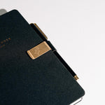 Puedes engancharlo a la portada de tu cuaderno o agenda con la pinza y ajustar tu bolígrafo favorito en el la pieza de piel vegana.