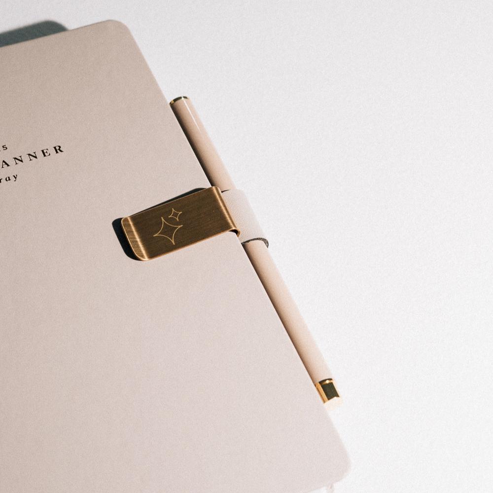 Puedes engancharlo a la portada de tu cuaderno o agenda con la pinza y ajustar tu bolígrafo favorito en el la pieza de piel vegana.