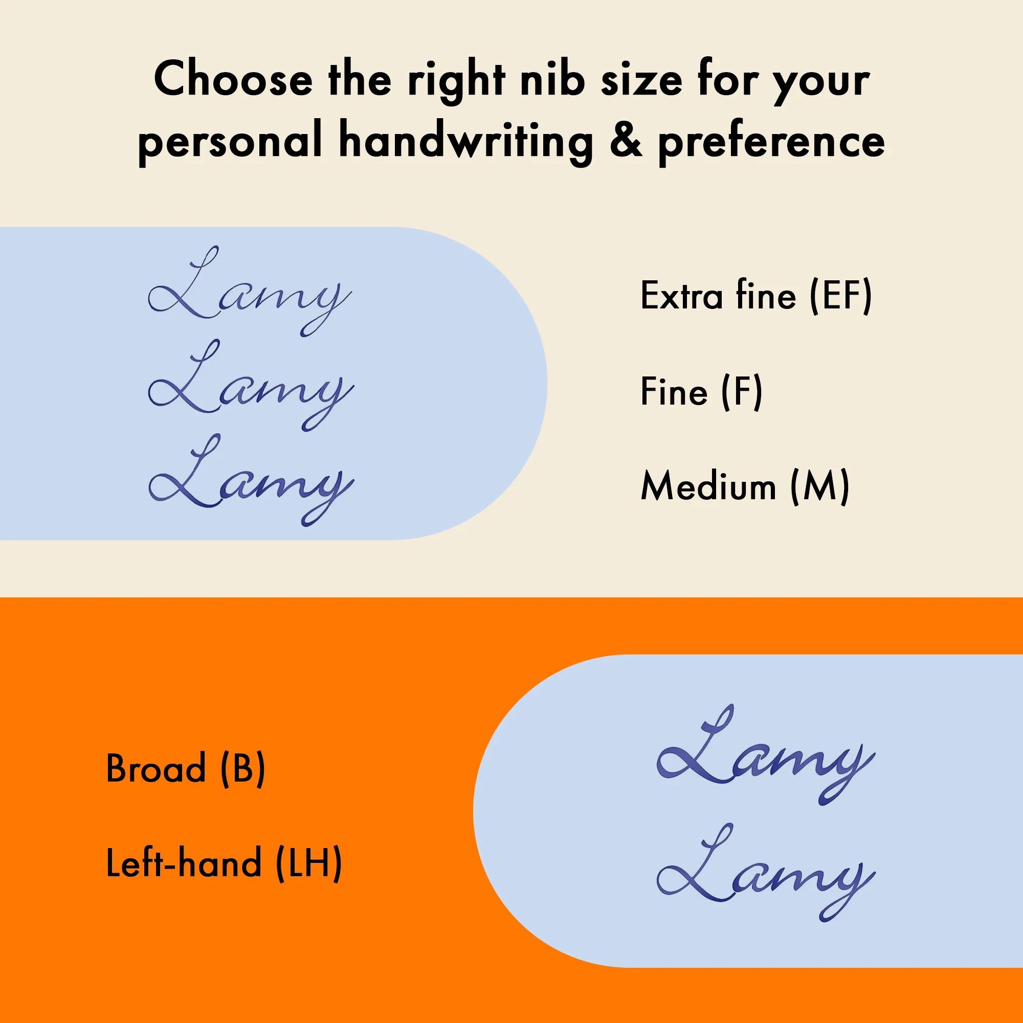 Equipada con un plumín de acero inoxidable pulido, la escritura es fluida y uniforme. Incluye un cartucho de tinta azul LAMY T10 y es compatible con convertidor LAMY Z28 para quienes prefieren tintero.