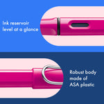 Incluye una empuñadura ergonómica que favorece una postura de escritura natural, incluso tras largas sesiones. Además, su ventana lateral permite controlar en todo momento el nivel de tinta.