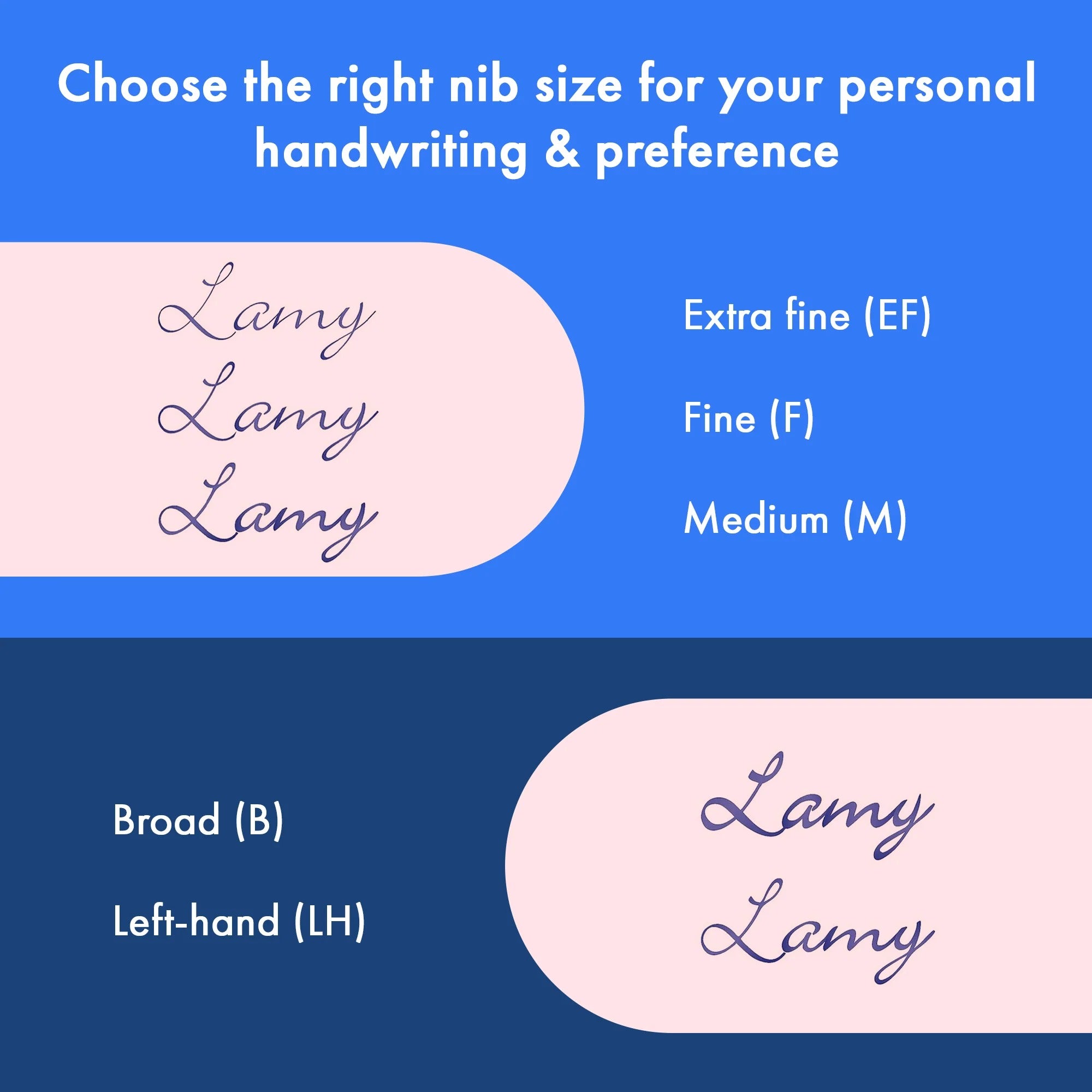 Equipada con un plumín negro de acero inoxidable pulido, la Safari garantiza una escritura suave y precisa. Se entrega con un cartucho de tinta azul LAMY T10 y es compatible con convertidor LAMY Z28 para quienes prefieren tintero.