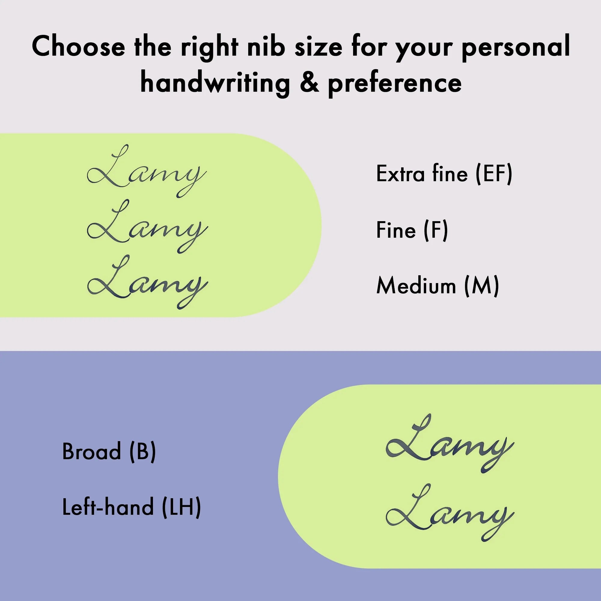 Equipada con un plumín negro de acero inoxidable pulido, la Safari garantiza una escritura suave y precisa. Se entrega con un cartucho de tinta azul LAMY T10 y es compatible con convertidor LAMY Z28 para quienes prefieren tintero.