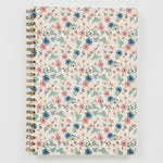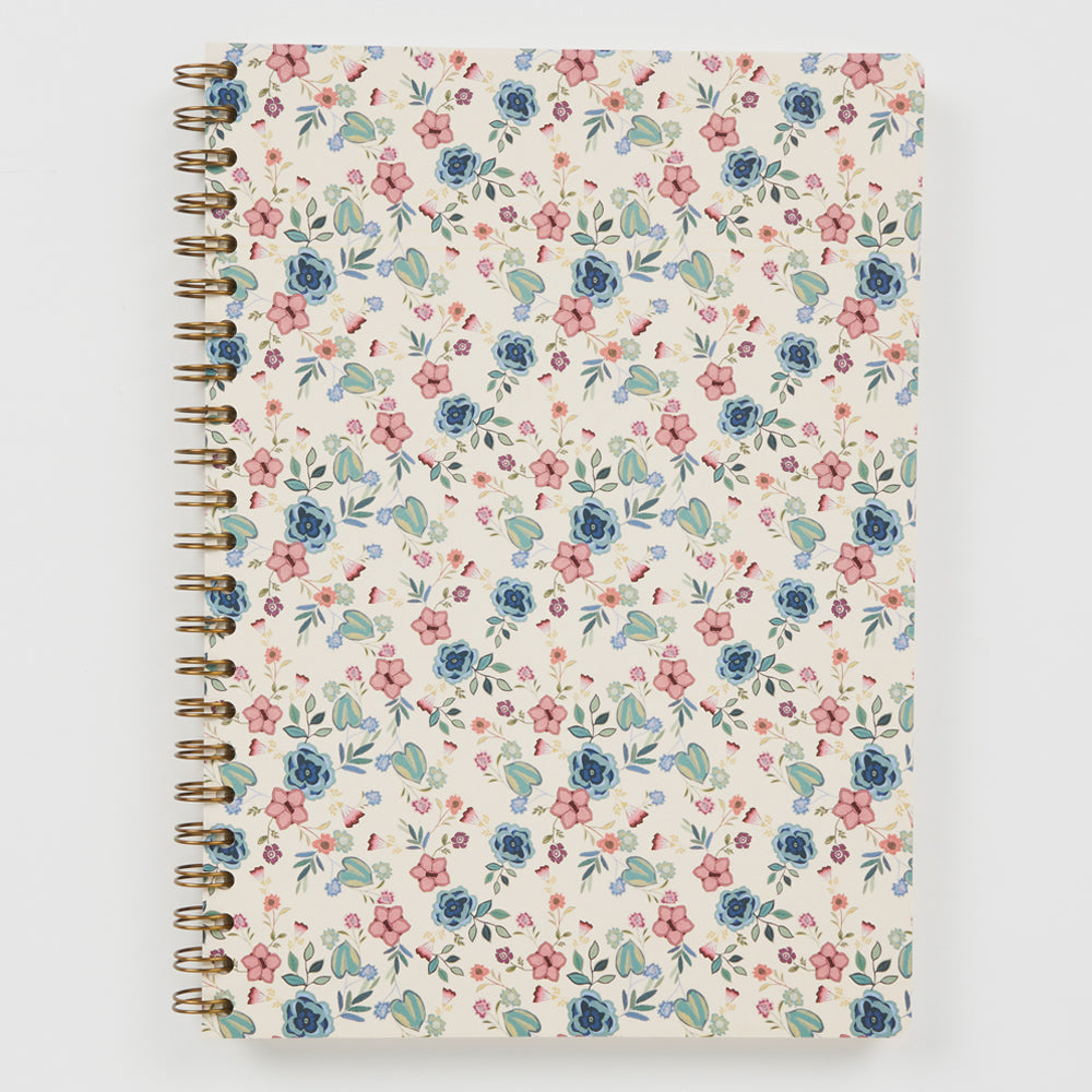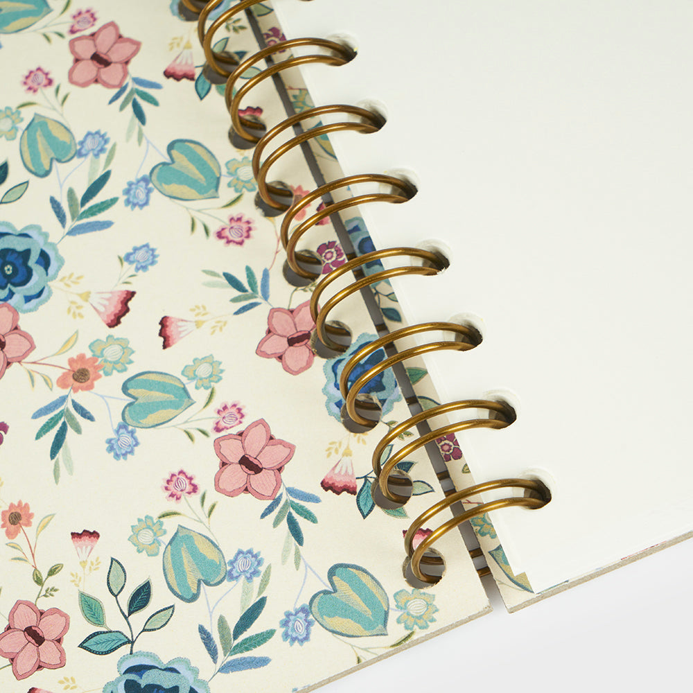 Libreta tamaño A4 con hojas blancas lisas. Encuadernación con espiral wyro y con las tapas forradas artesanalmente en papel estampado con unas bonitas flores.
