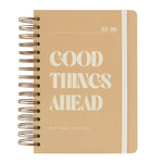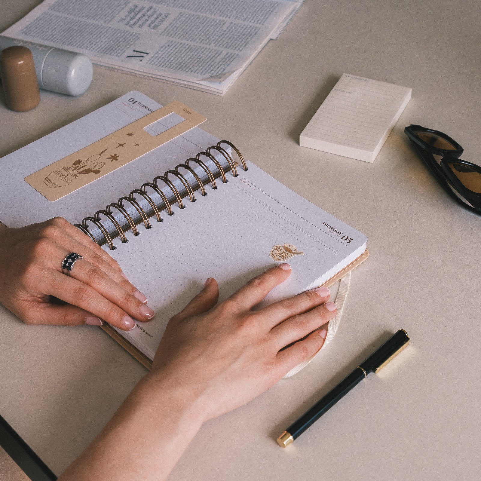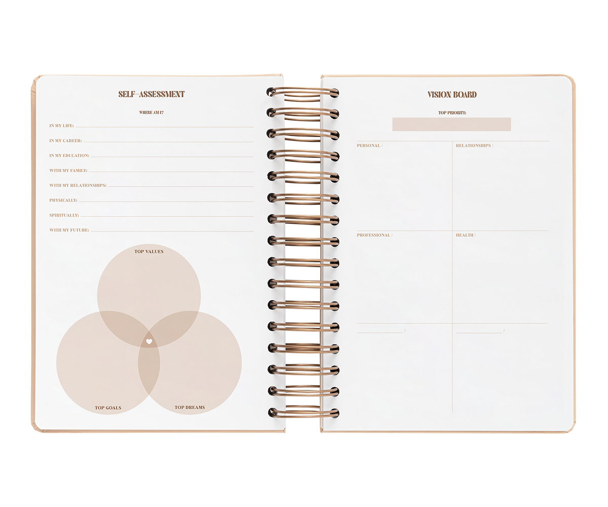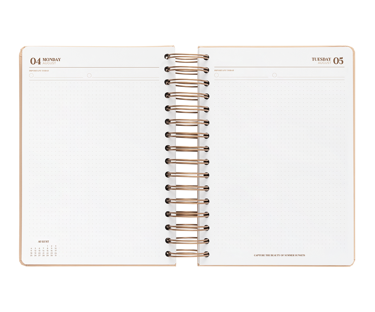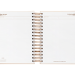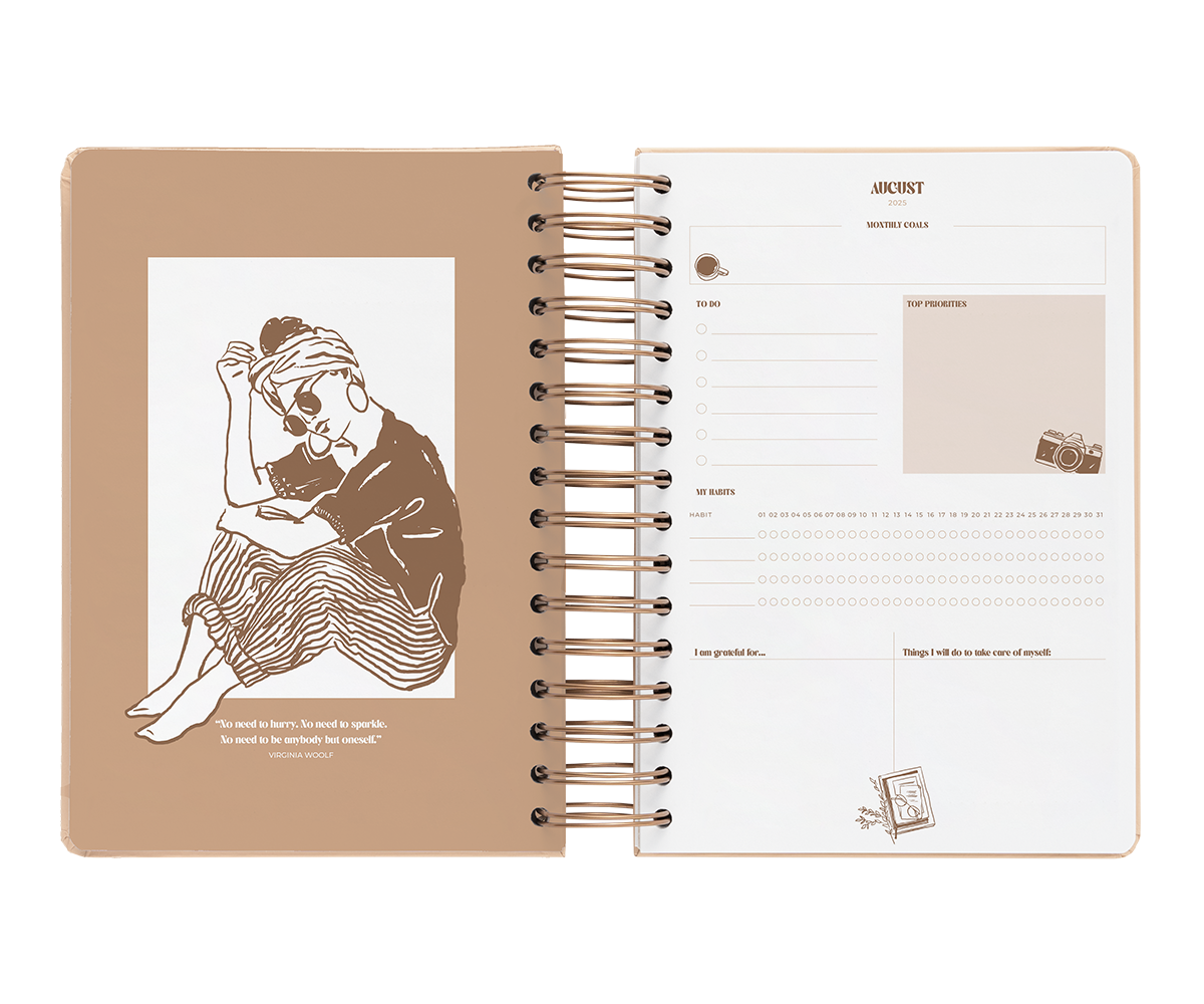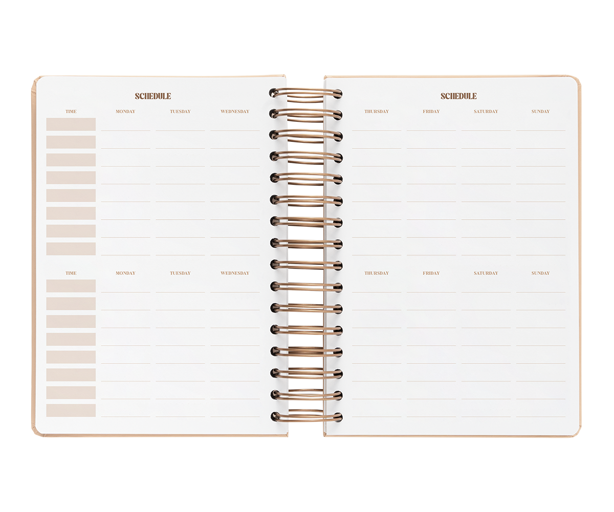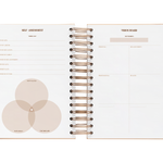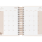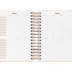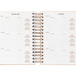 El interior esta diseñado con suaves tonos neutros. La vista es de un día por página por lo que tendrás mucho espacio para organizar tu día. Además también incluye vision board, planificador de gastos, horarios, plazos de entrega, prioridades mensuales con seguimiento de hábitos, planificador mensual y 6 hojas de notas.