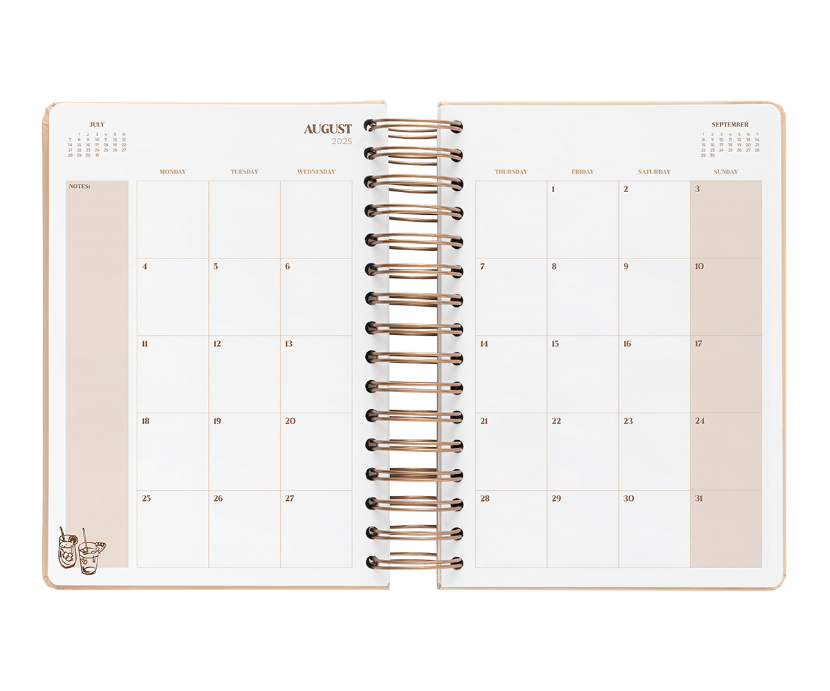 Agenda académica día página de 12 meses, va desde Agosto 2025 hasta Julio 2026, tamaño A5.