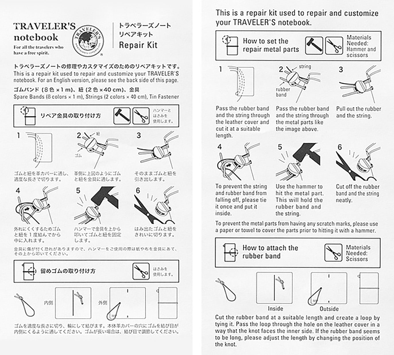 This is a kit to repair and customize your TRAVELER'S Notebook. Includes a tin closure, 8 colored elastic band replacements and 2 rubber bands to adjust to the cover.