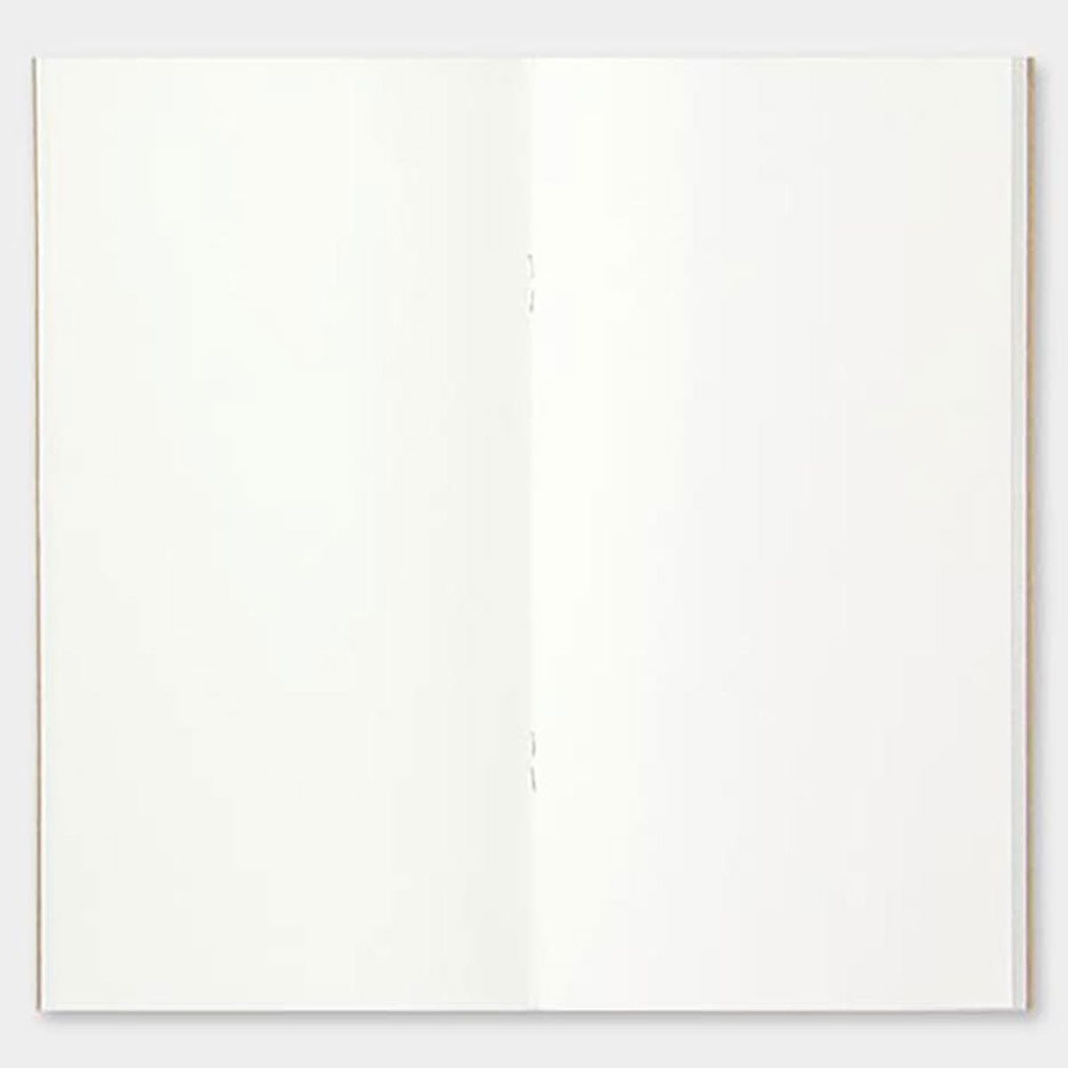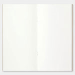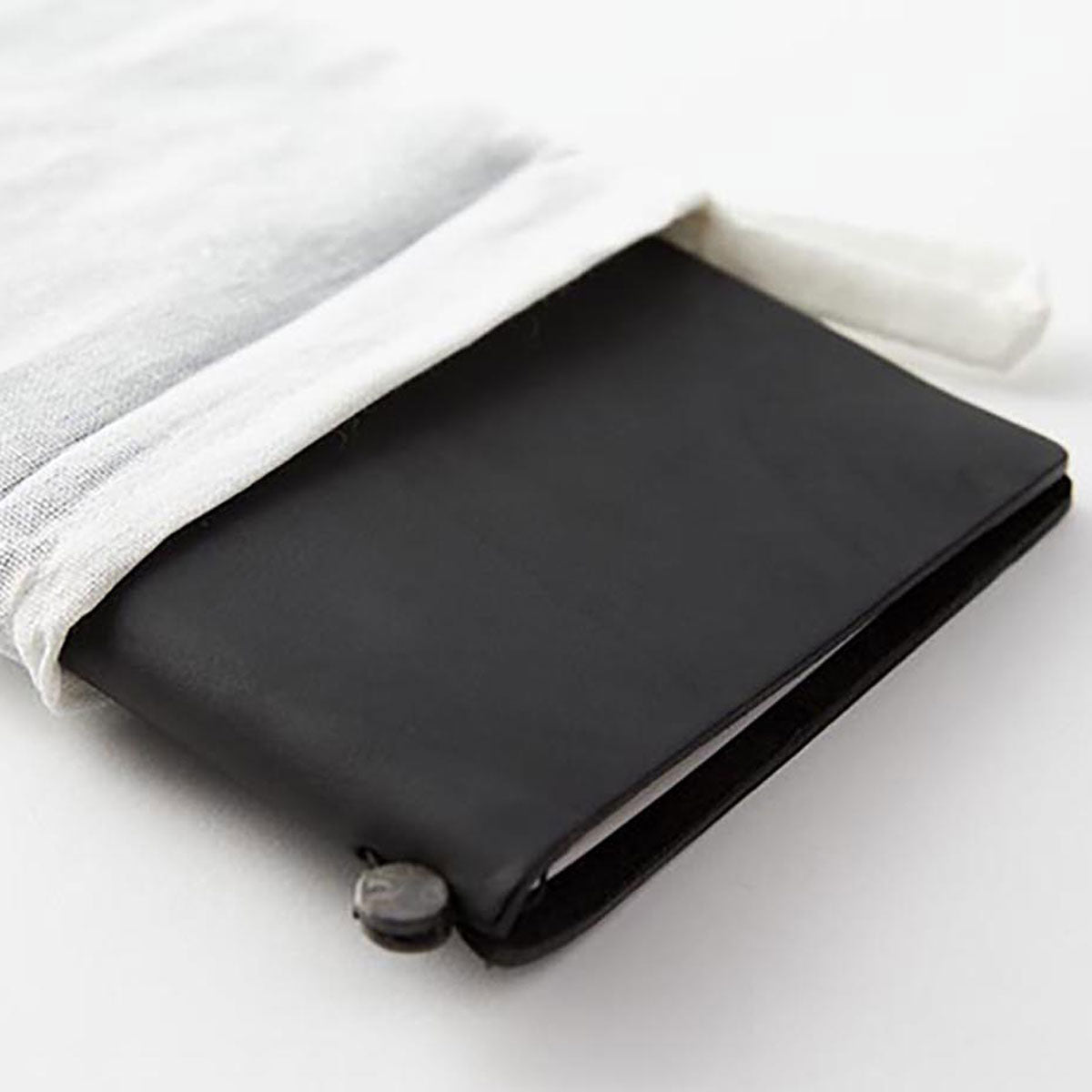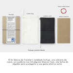 Basic kit of the TRAVELER'S Notebook passport size. Includes a leather cover, a notebook with 64 plain white pages, a cotton bag to protect it and an extra elastic band.