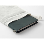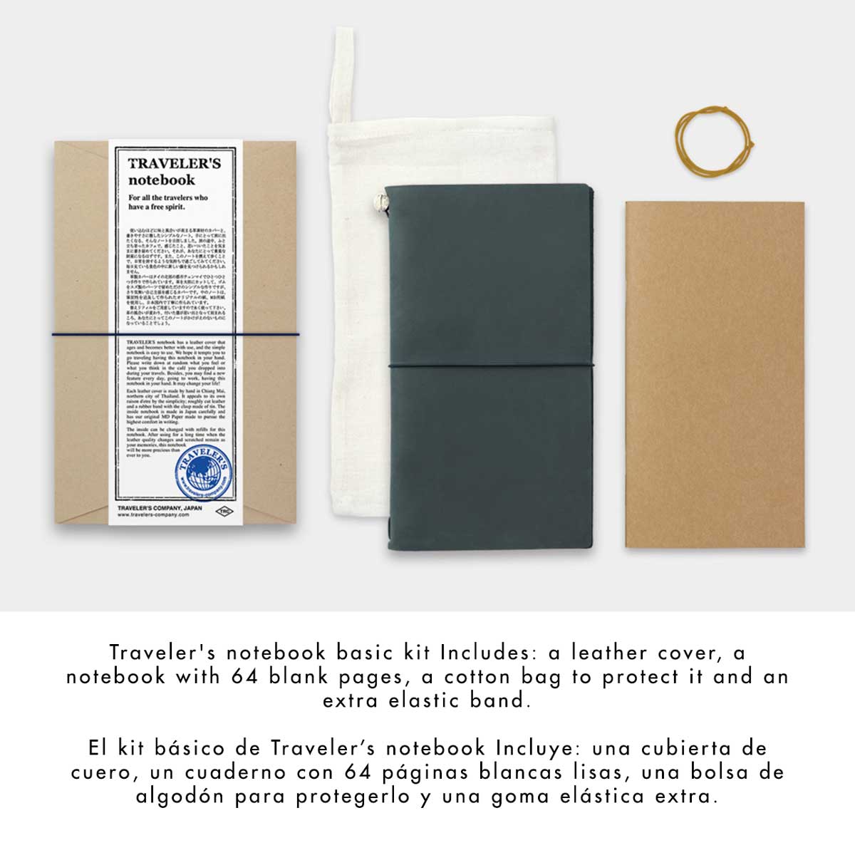 Basic kit of the TRAVELER'S Notebook passport size. Includes a leather cover, a notebook with 64 plain white pages, a cotton bag to protect it and an extra elastic band.
