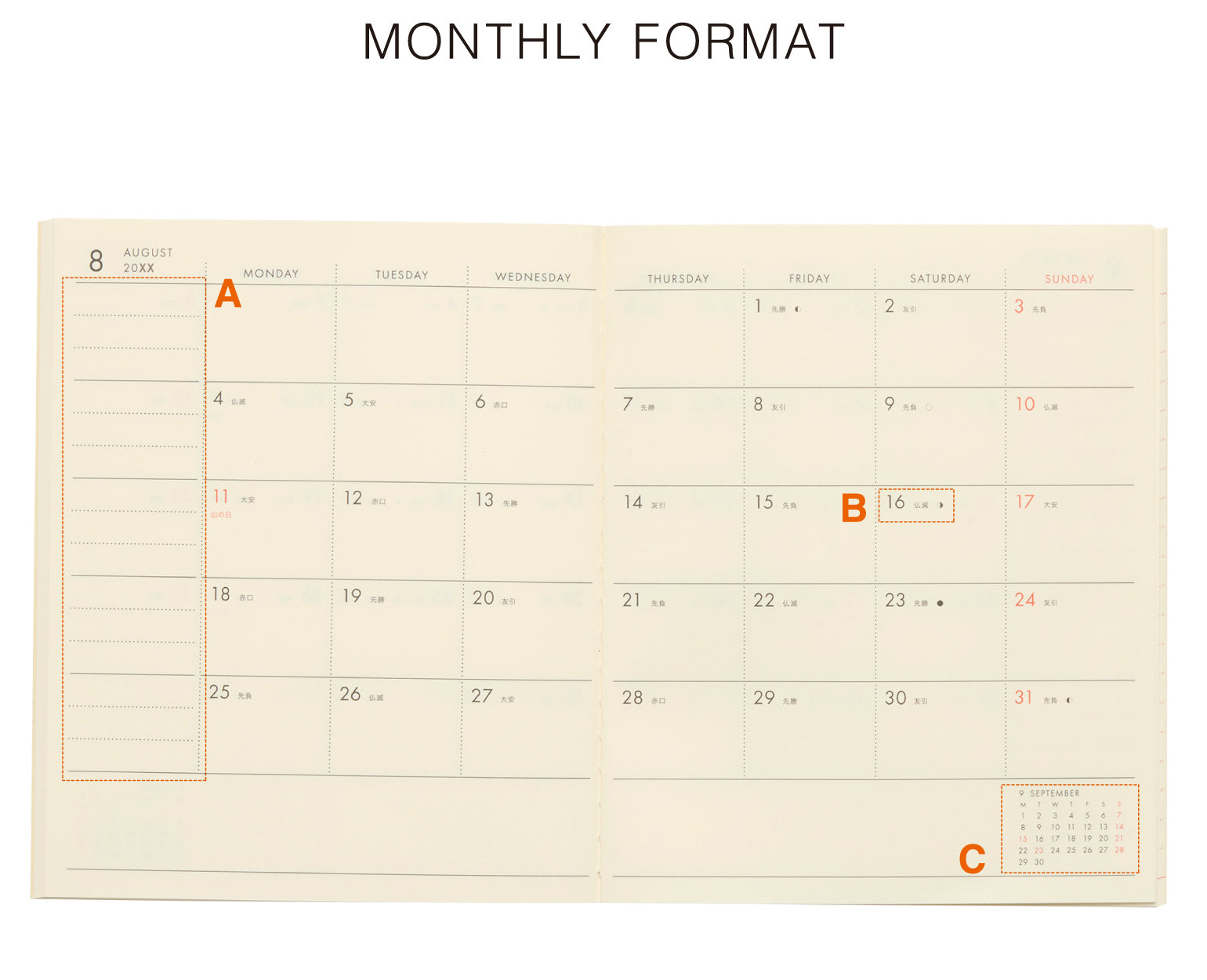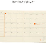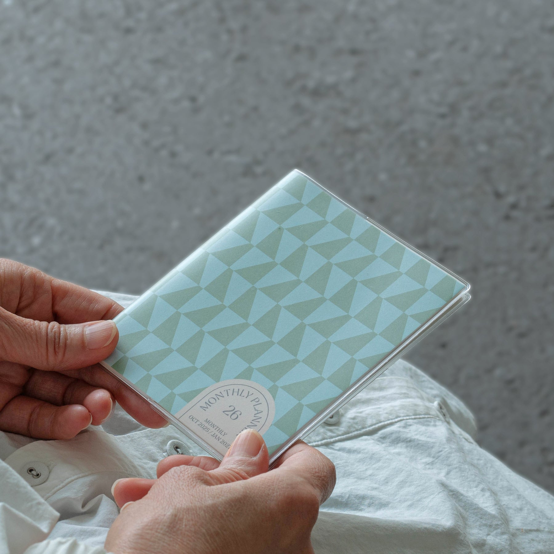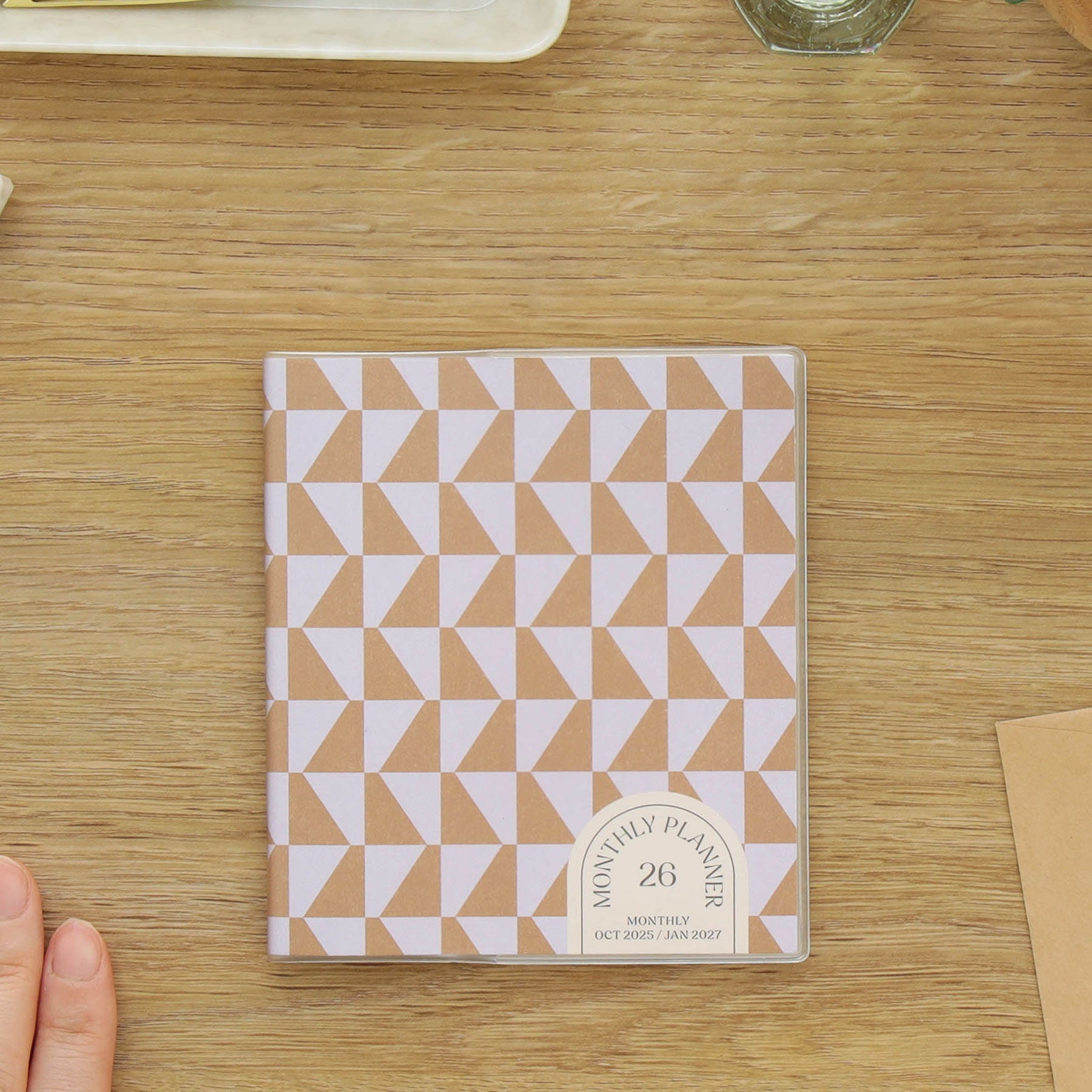 Monthly planner in a square format, lightweight and compact, covering October 2025 to January 2027. Includes an annual calendar, monthly spreads across two pages with space for notes, and opens fully for comfortable writing. Flexible transparent cover, 64 pages in total, made in Japan