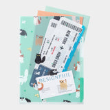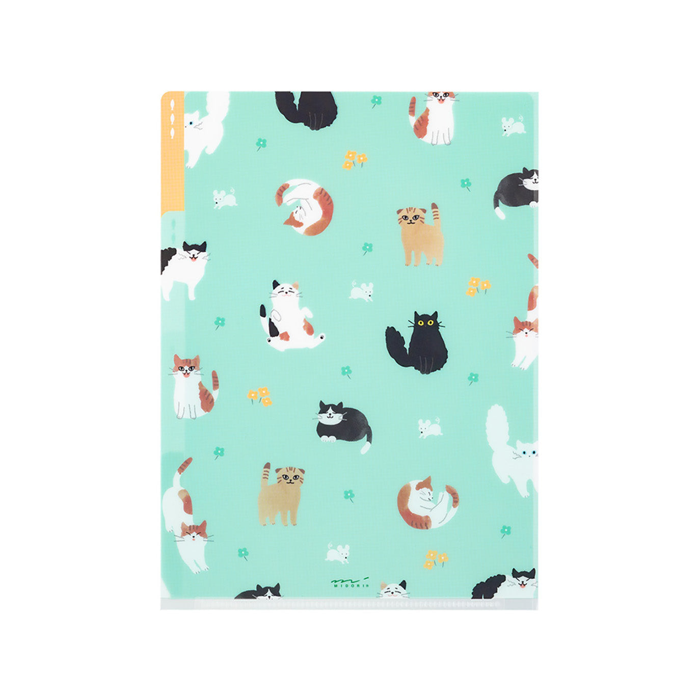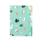 Translucent A5-size folder with 3 pockets for sorting documents. It features a charming cat design, with a transparent front cover and mint green inner dividers.