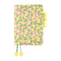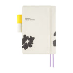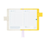Inside, a calming beige pairs with vibrant yellow, and the bookmarks—slim ribbons in soft lavender—add a gentle accent. One half of the pen holder closure is also bright yellow, offering a cheerful touch even when the cover is closed.