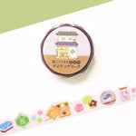 This beautiful adhesive tape is filled with elements you might find in a typical japanese sweets store. Its die-cut design follows the shapes of the illustrations, adding a dynamic touch and aesthetically fitting any composition, whether horizontal or vertical.