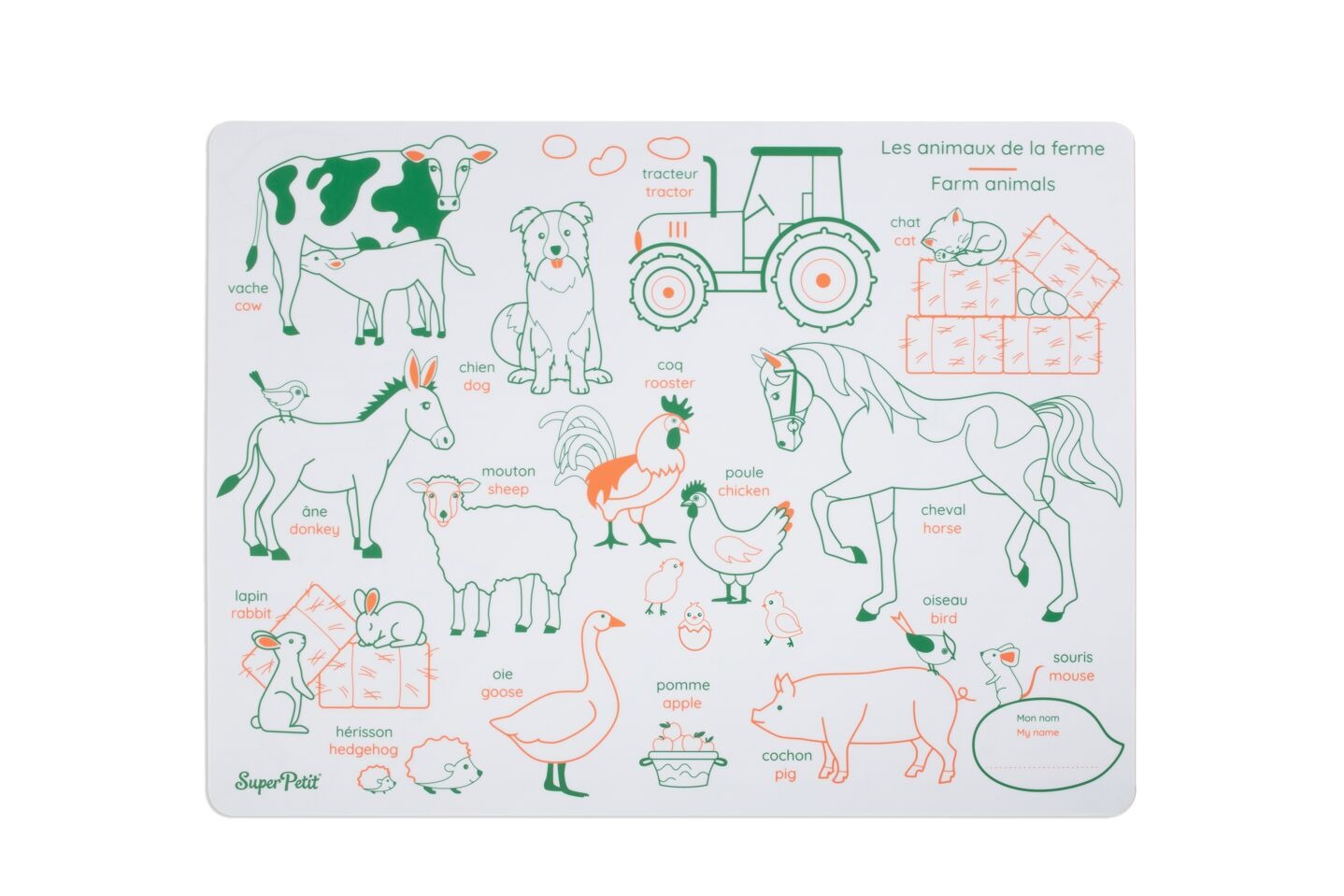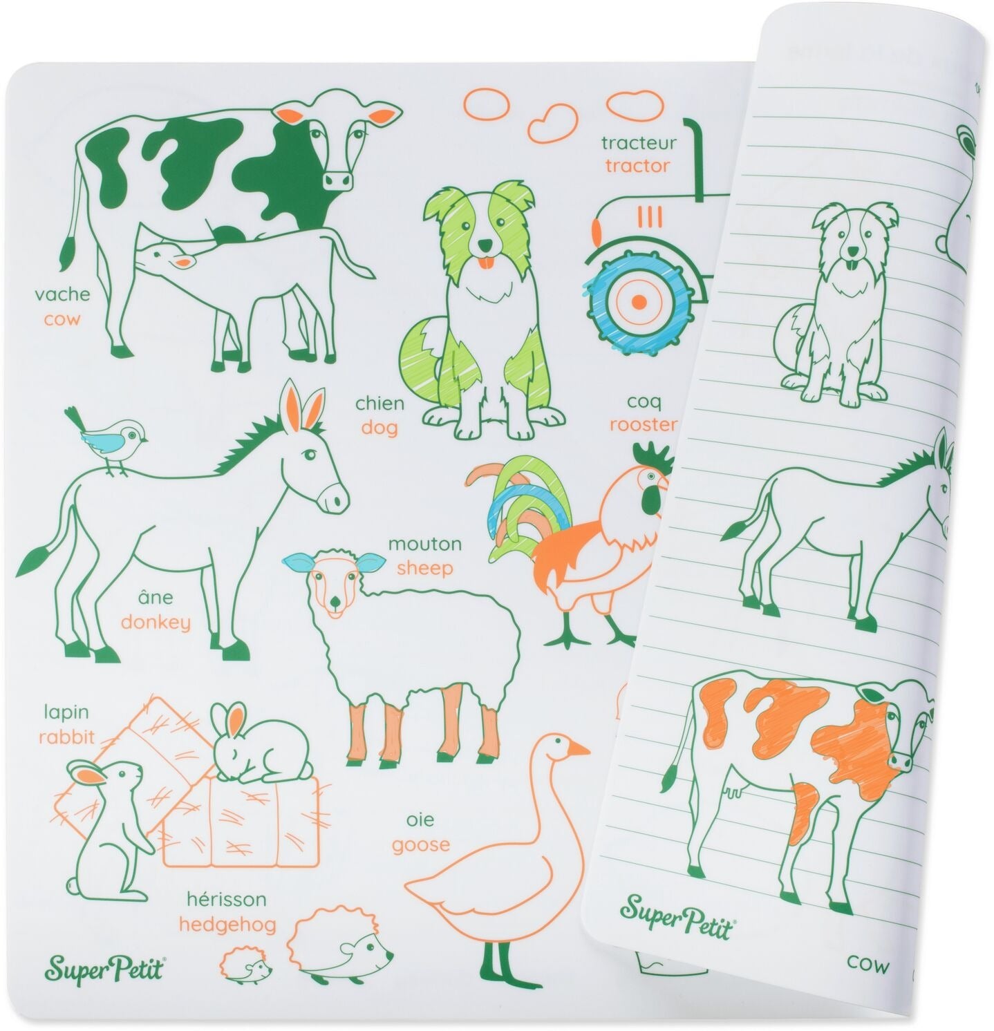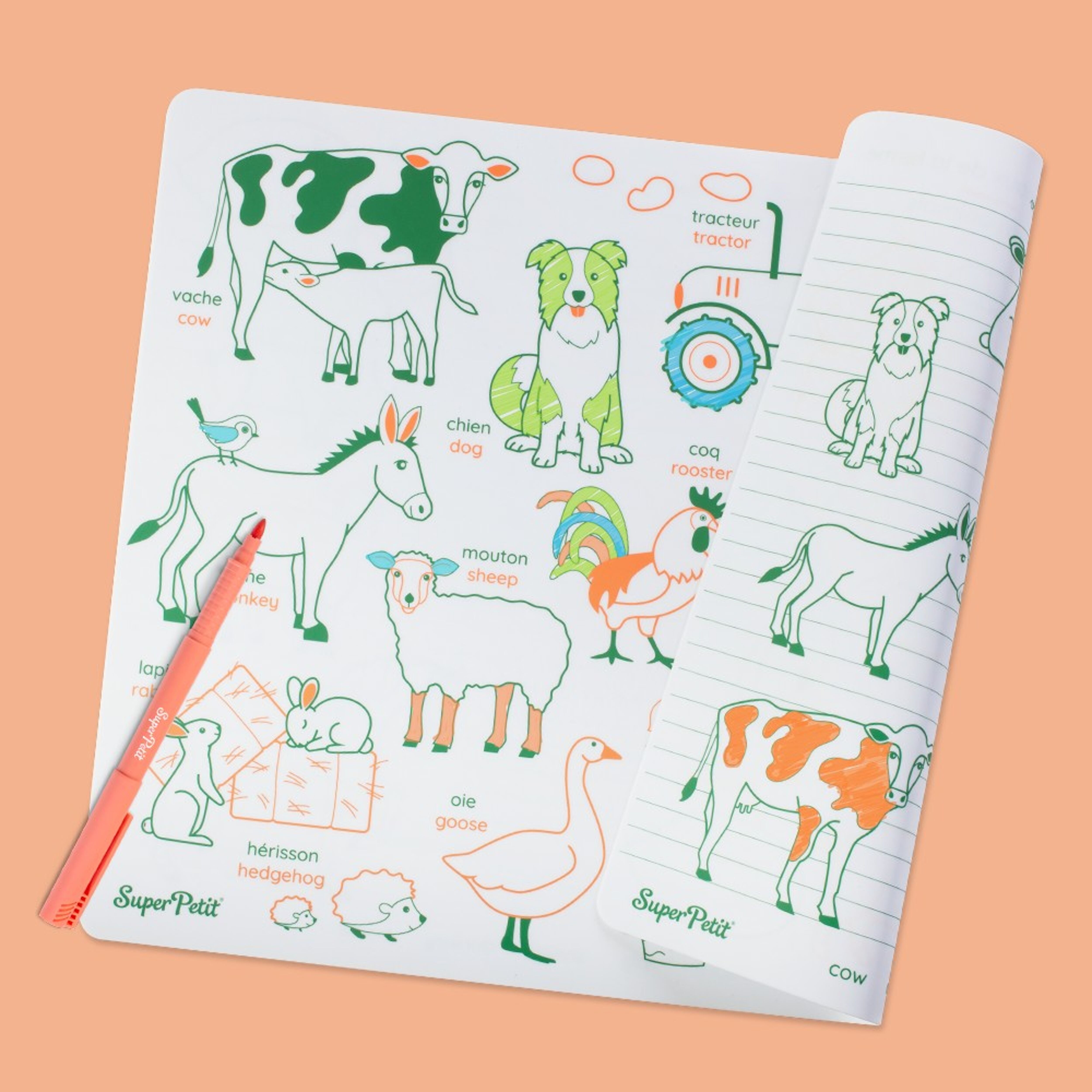 The "Farm Animals" game by Superpetit is an educational tool designed for children to learn about farm animals in a fun and creative way. It includes a non-toxic silicone placemat and erasable markers, allowing kids to color and learn repeatedly.