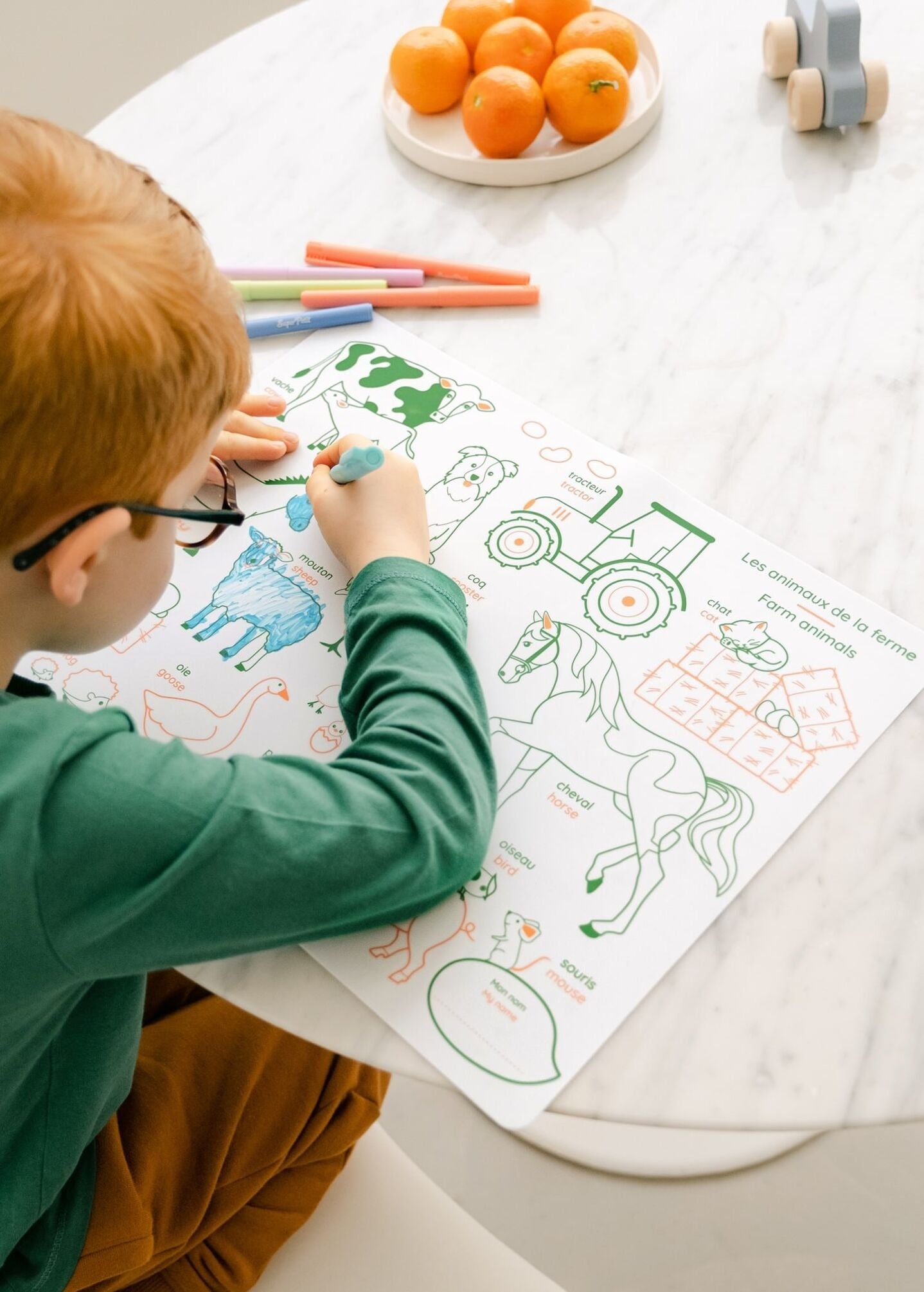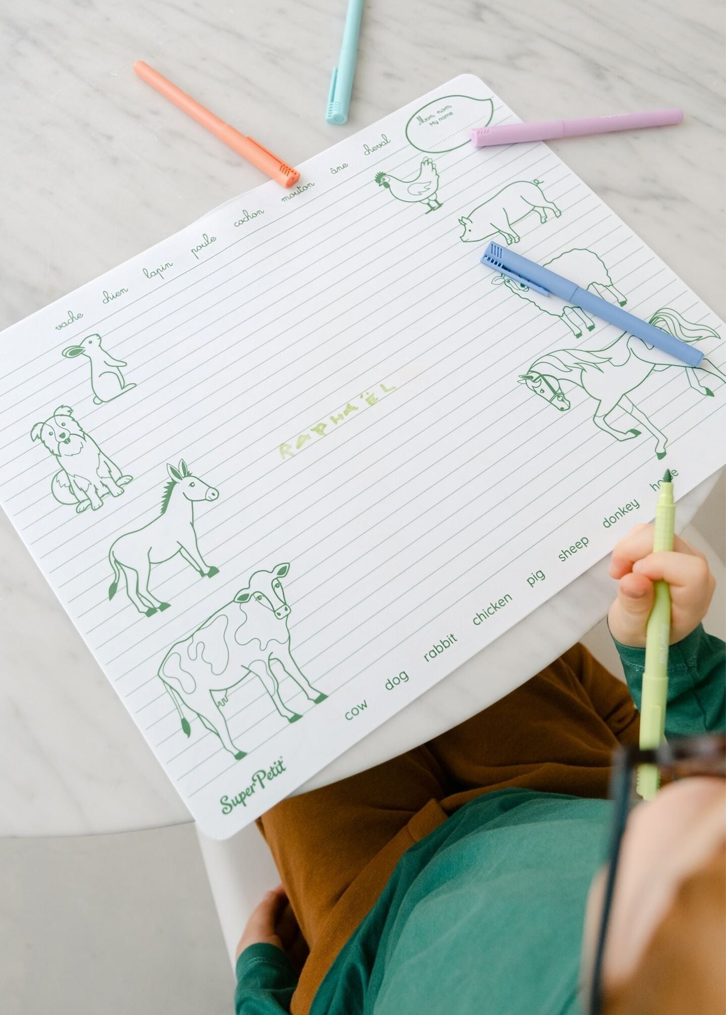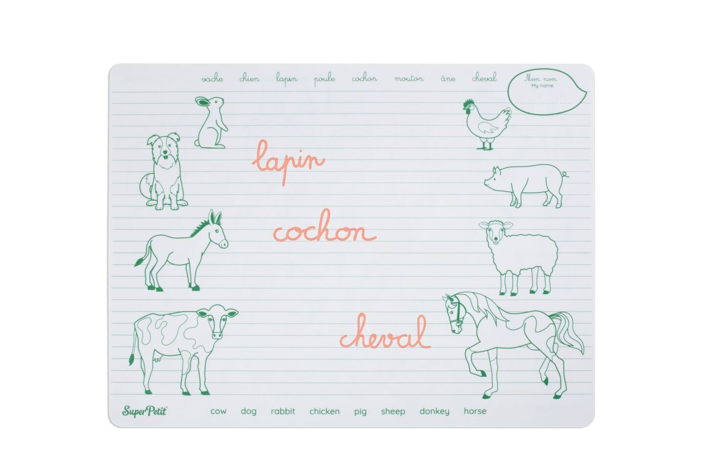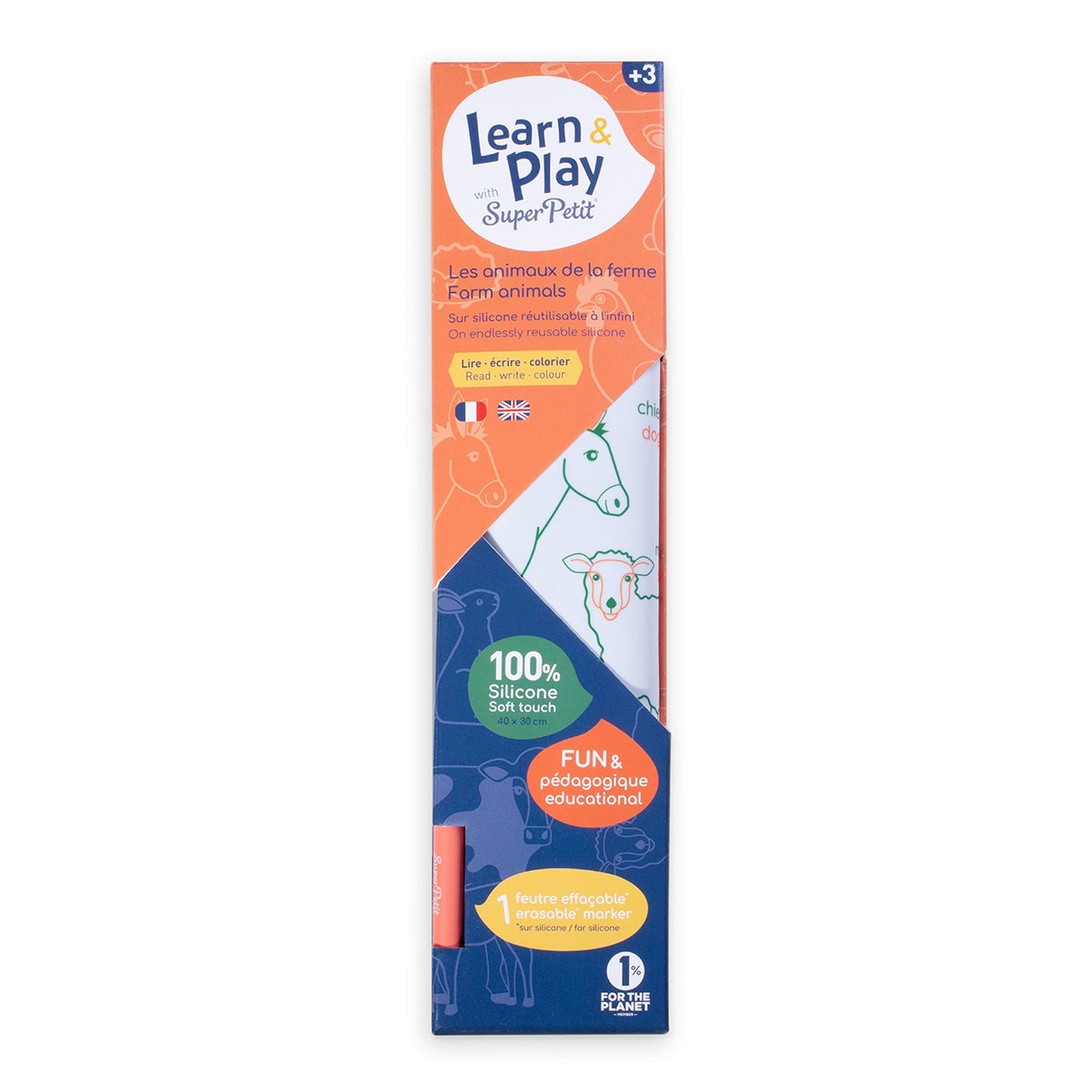 The "Farm Animals" game by Superpetit is an educational tool designed for children to learn about farm animals in a fun and creative way. It includes a non-toxic silicone placemat and erasable markers, allowing kids to color and learn repeatedly.