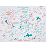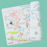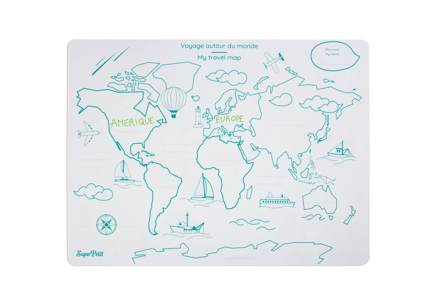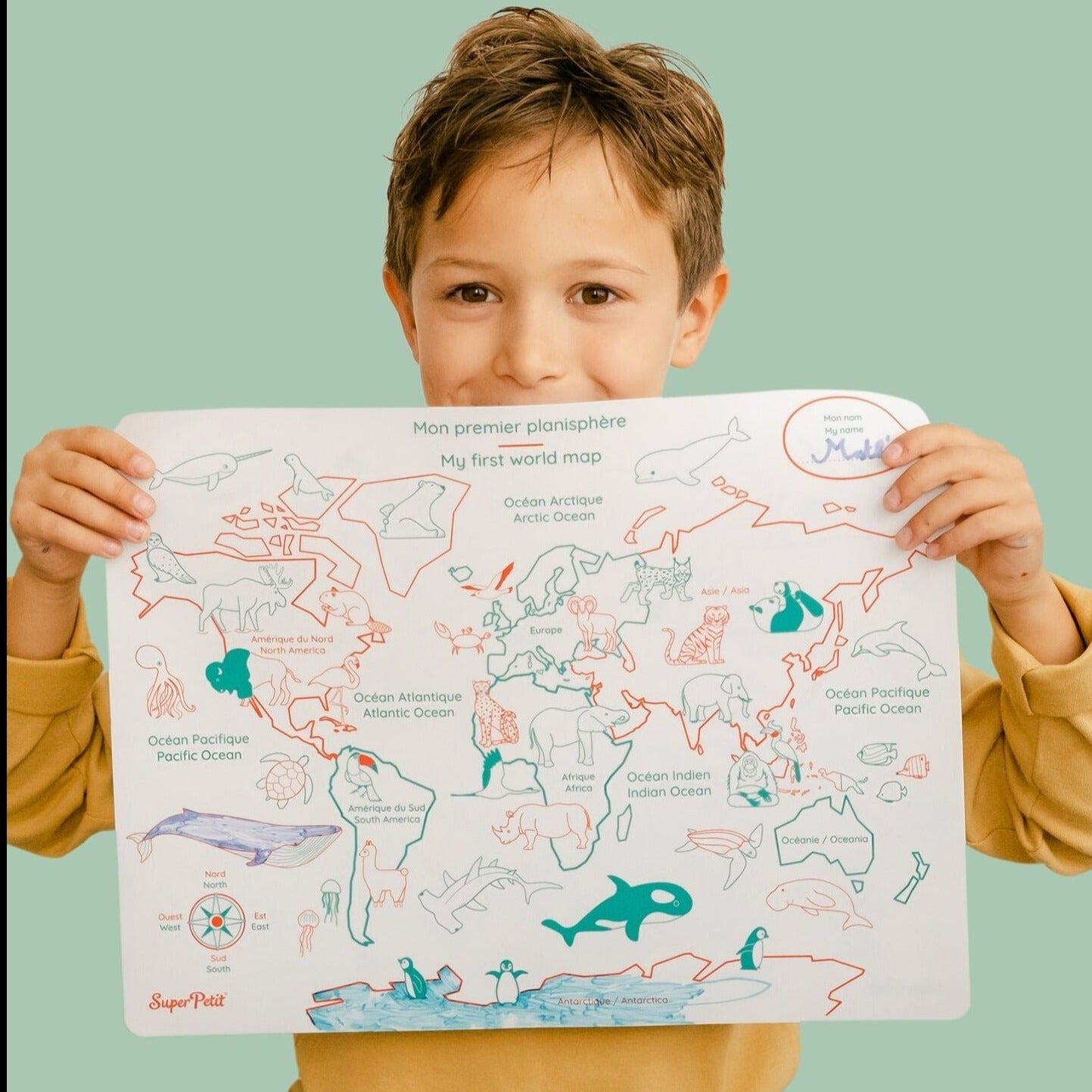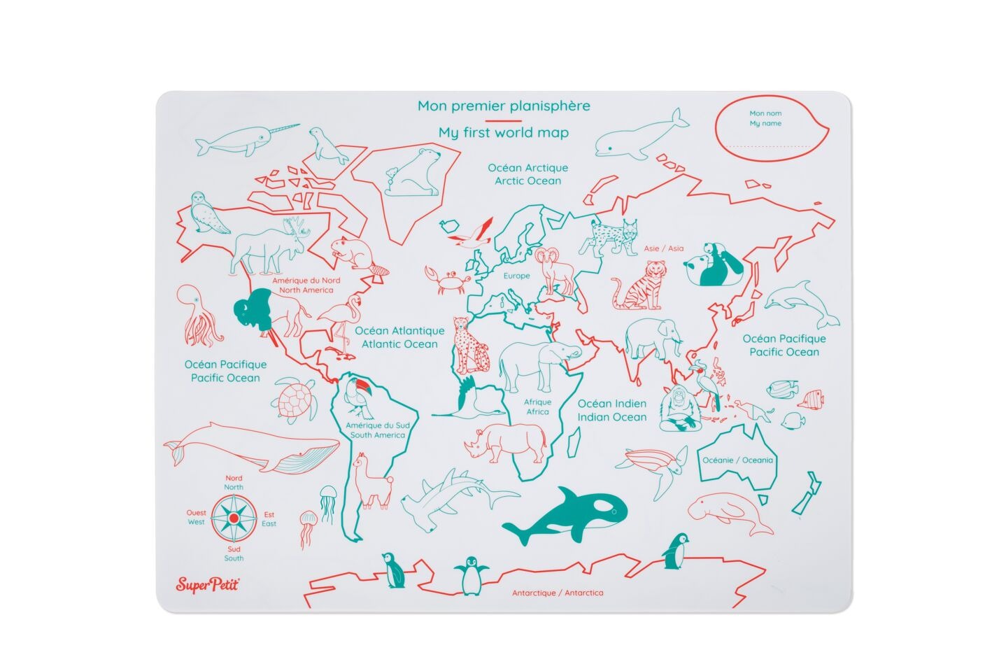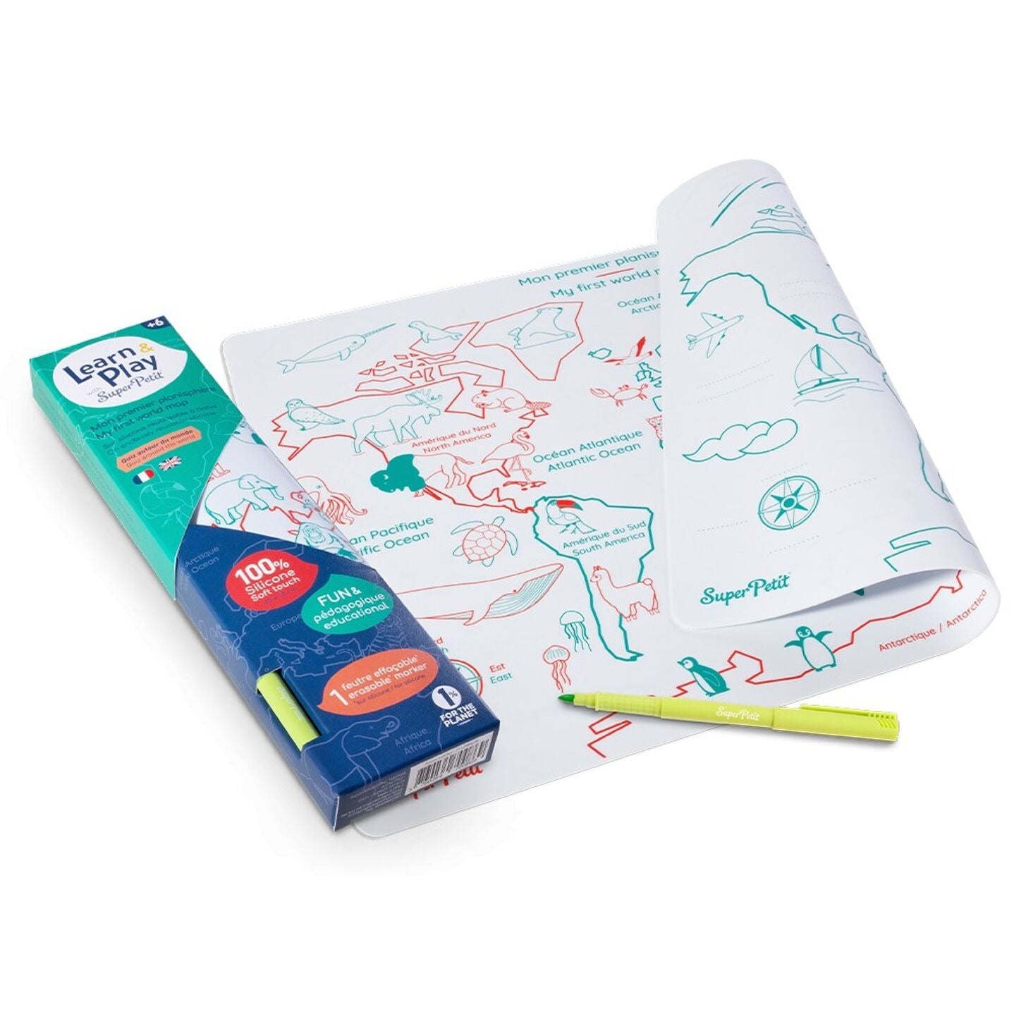 The "My First World Map" game by Superpetit is an educational tool designed for children to learn about geography and the wonders of the world in an entertaining and creative way. It includes a non-toxic silicone placemat and erasable markers, allowing kids to color and discover different countries, animals, and monuments repeatedly.