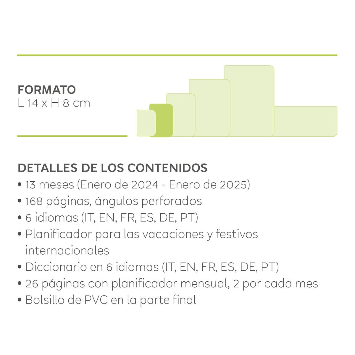 It includes 13 months (from January 2025 to January 2026), a soft cover, elastic closure, and 80 g/m² ivory paper, resistant to pens. With extras like a PVC pocket and vacation planner, it’s the perfect companion to stay organized with a touch of freshness and color.
