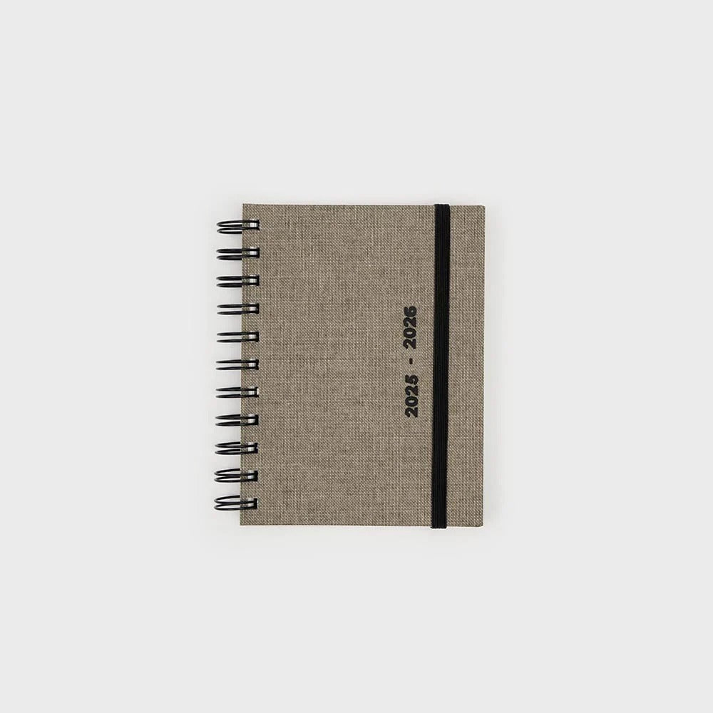 - The planner cover is wrapped in canvas fabric, has an embossed "2025-2026" engraving, and closes with an elastic band.