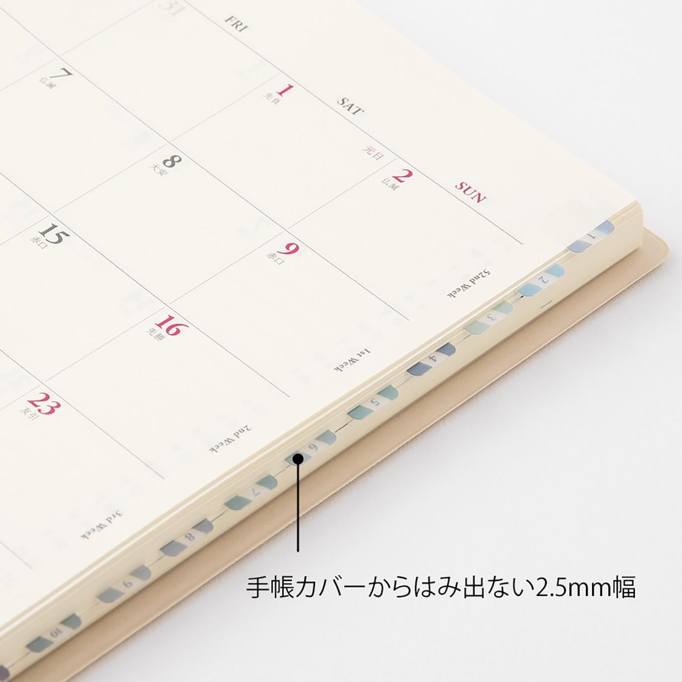MIDORI Chiratto index labels, made from PET, for organizing diaries and notebooks. Their design allows the indexes to remain discreetly within the cover. Ideal for efficient and aesthetic organization.