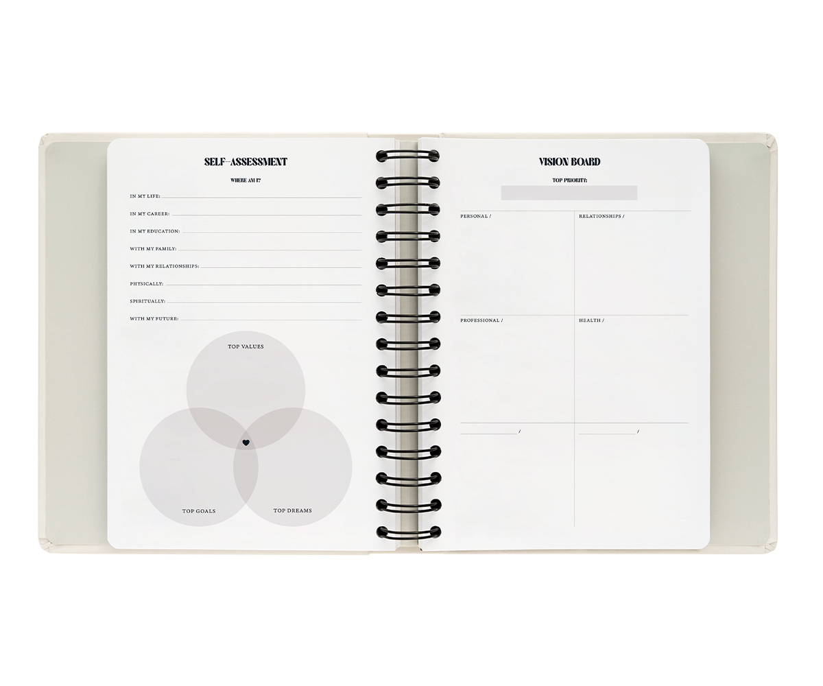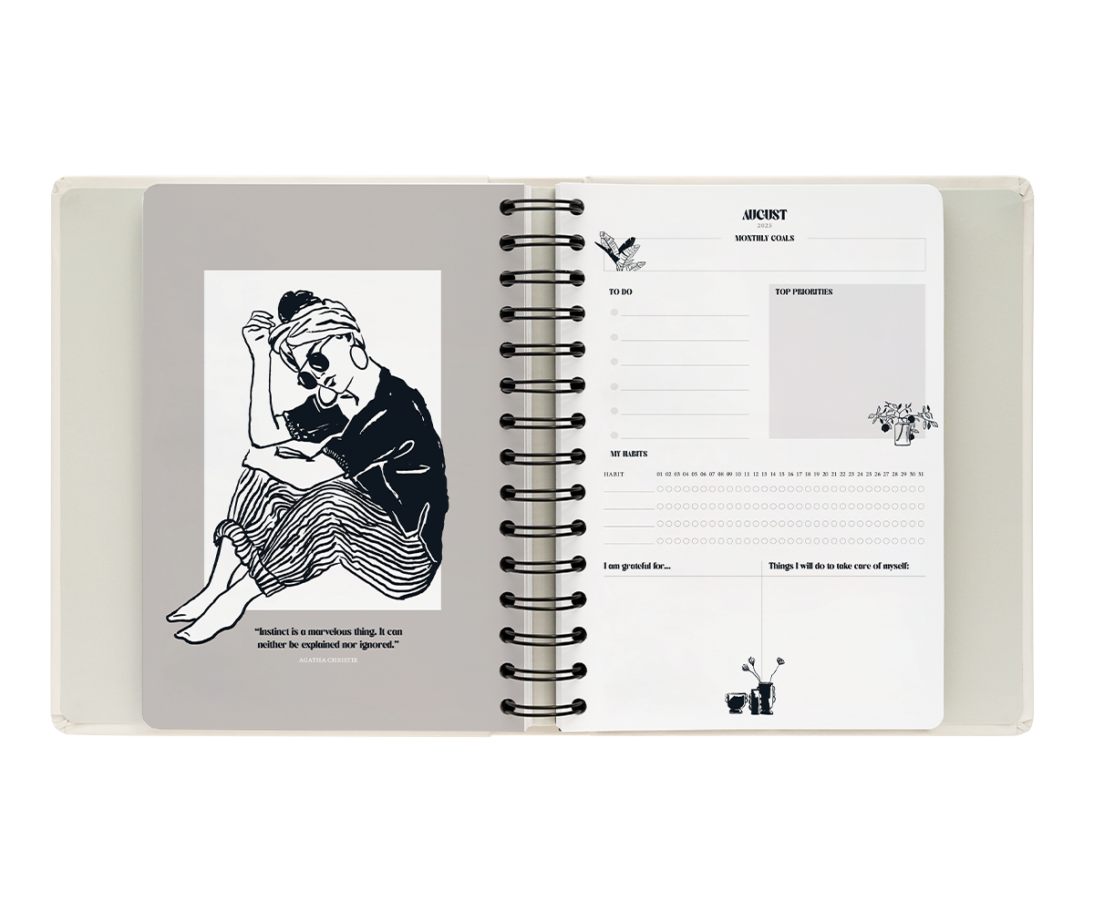 The interior includes: vision board, budget planner, schedules, deadline tracker, monthly priorities with habit tracking, monthly planner, and 8 note pages.