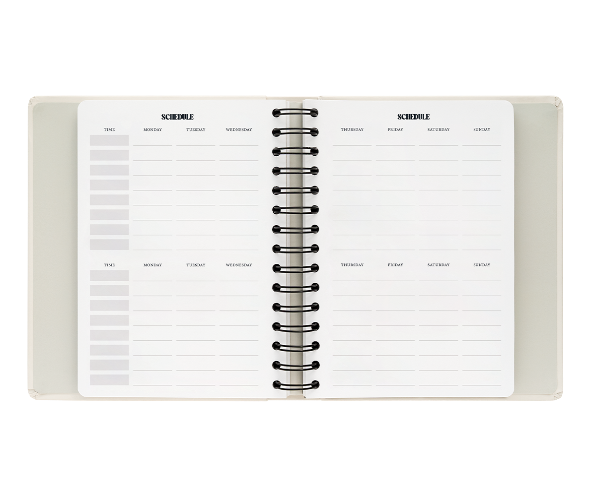The weekly layout spans two pages in a grid format. Monday to Thursday appear on the right-hand page, while Friday to Sunday and a notes section are on the left-hand page.