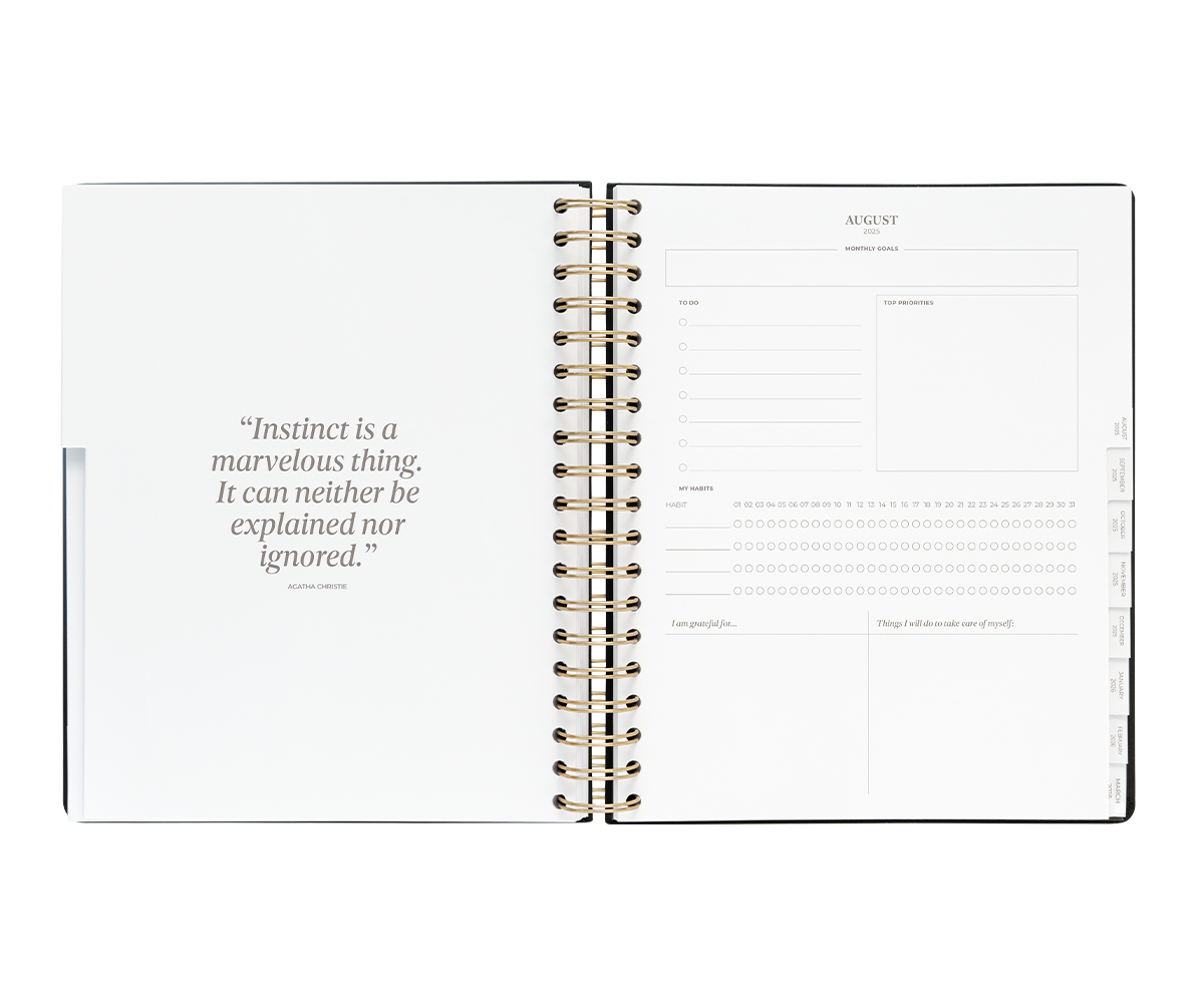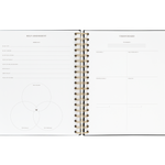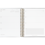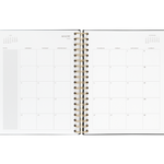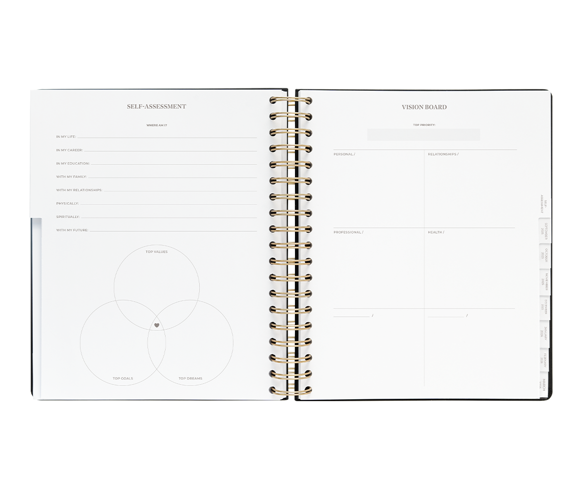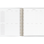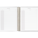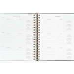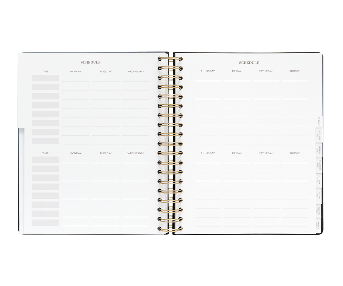 The interior is designed with beautiful neutral tones. The weekly view is presented on 2 pages and the layout is in the form of a grid. From Monday to Thursday on odd page and from Friday to Sunday with a space for notes, on even page. It also includes a vision board, expense planner, schedules, delivery deadlines, monthly priorities with habit tracking, a monthly planner, and 6 note pages.