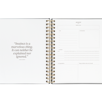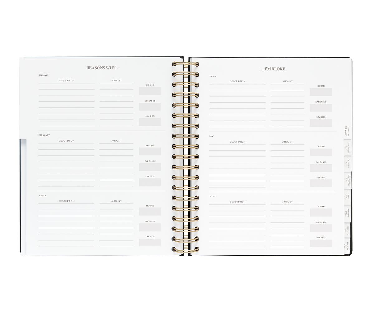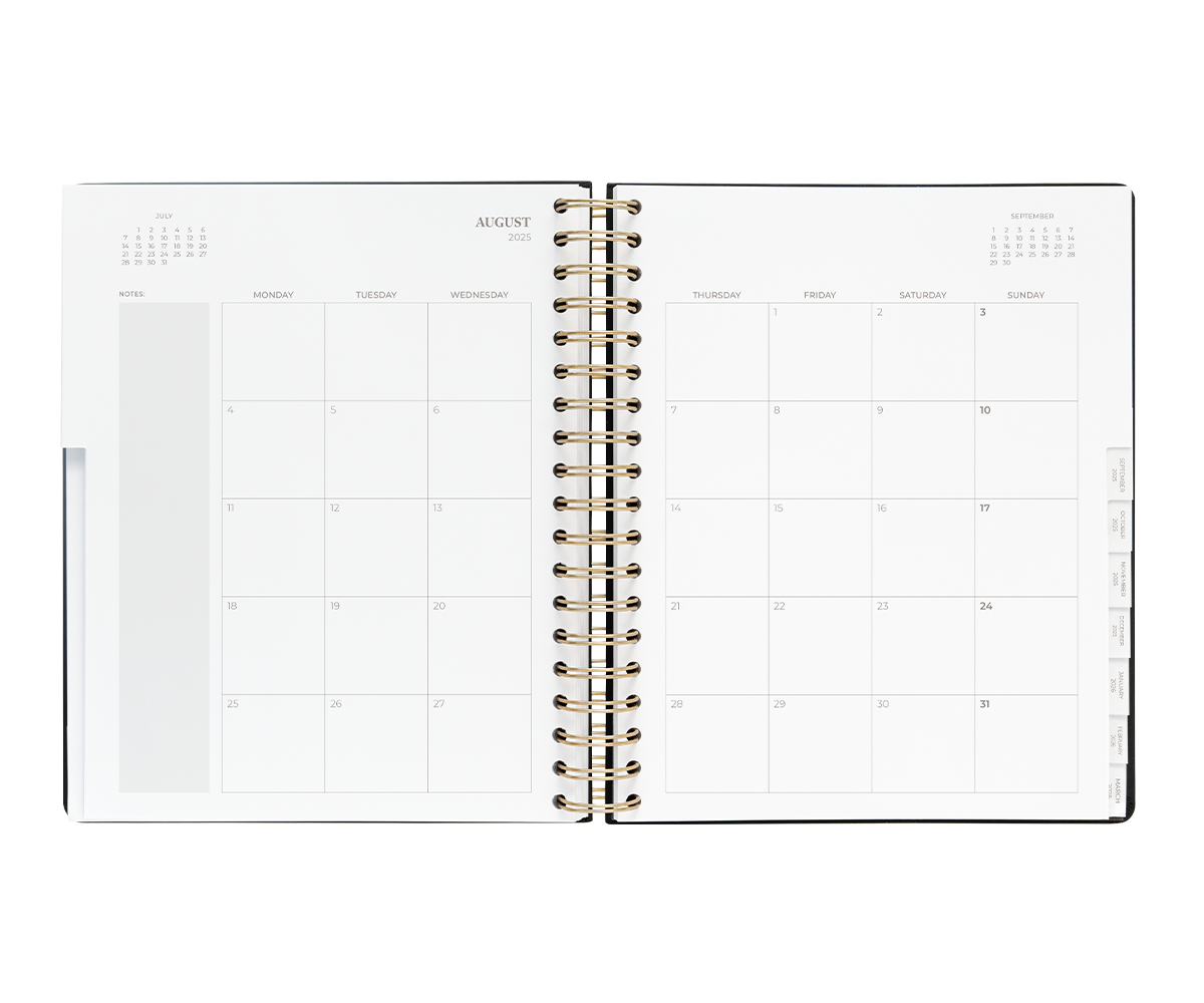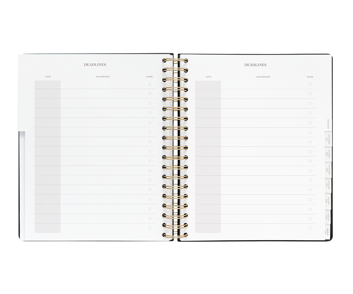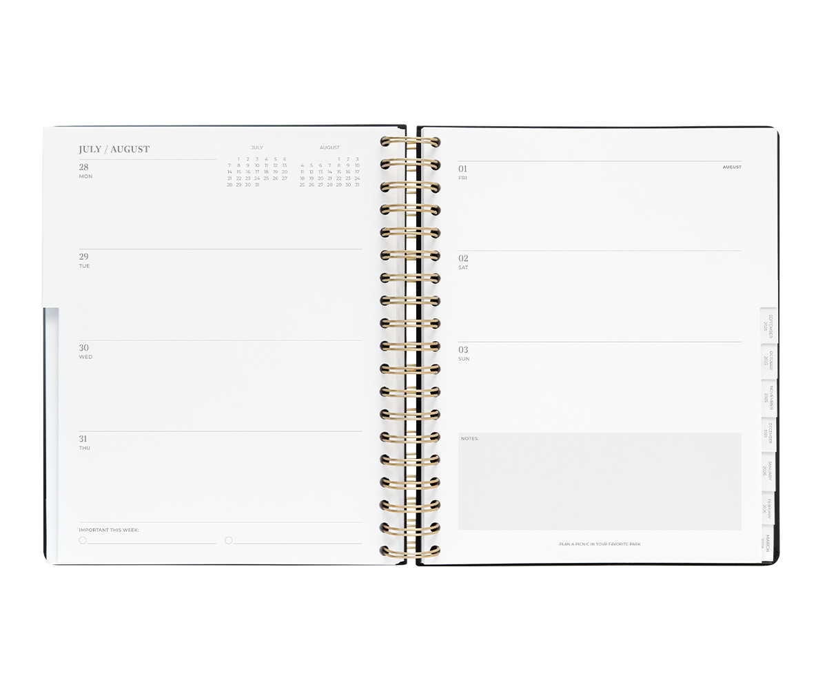 The interior is designed with beautiful neutral tones. The weekly view is presented on 2 pages and the layout is in the form of a grid. From Monday to Thursday on odd page and from Friday to Sunday with a space for notes, on even page. It also includes a vision board, expense planner, schedules, delivery deadlines, monthly priorities with habit tracking, a monthly planner, and 6 note pages.
