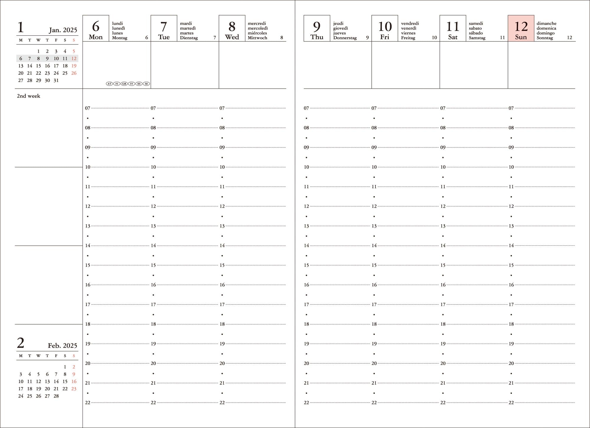 The interior is designed vertically from Monday to Sunday, which makes it very practical because you can see and organize your week at a glance. Each week is presented in 2 pages in which each day is divided by hours from 7am to 10pm . It also includes 3 free spaces in each week for notes or to-do lists and also includes the monthly calendar.
