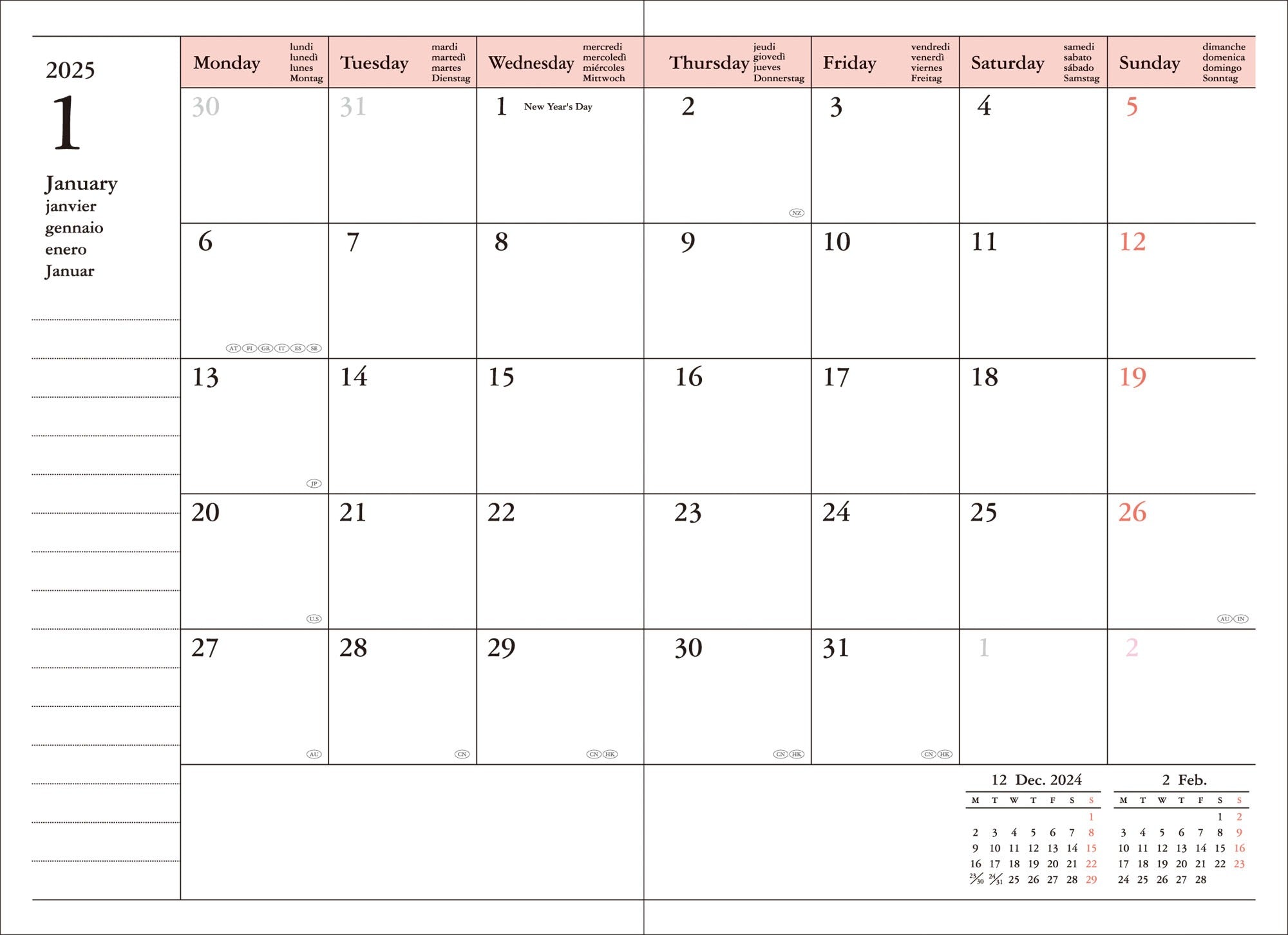 • Weekly Plan: From August 26th, 2025 to January 4th, 2027. Each week on a double page, with 16 hours vertically. Day number and week number. Parties from 27 countries, including Spain.