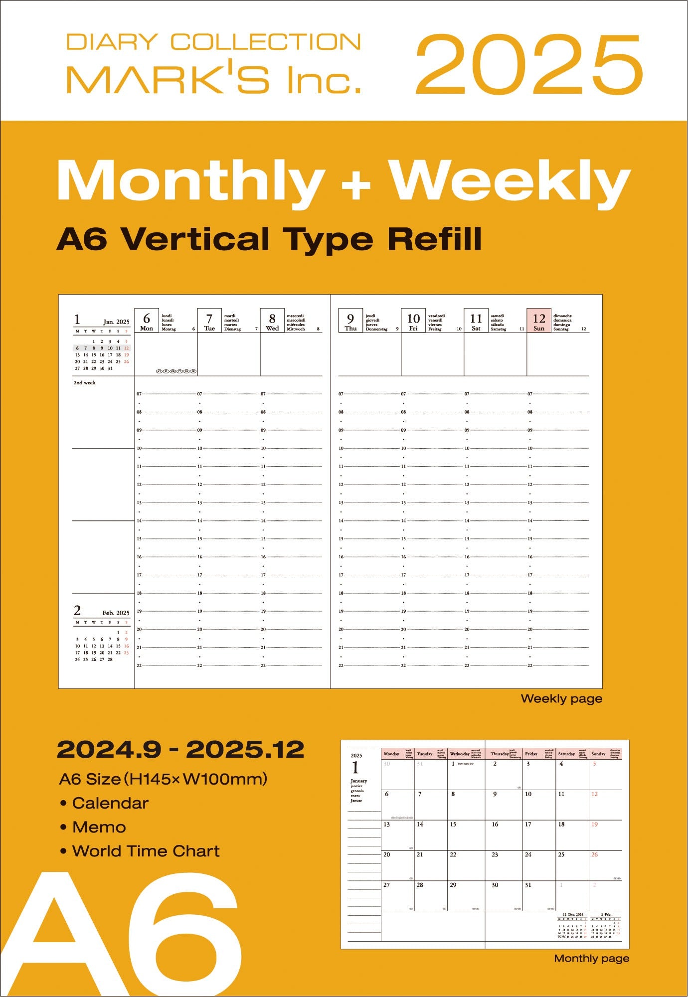 Vertical Weekly Planner Refill, September 2025 to December 2026 A6 size.