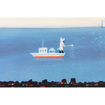 The Hobonichi 5-Year Techo A6 Cover “The Sea’s Dream at Dawn” features artwork by Hiroko Kubota, depicting a tranquil sea at sunrise, a guiding lighthouse, and a cat boarding a small boat.